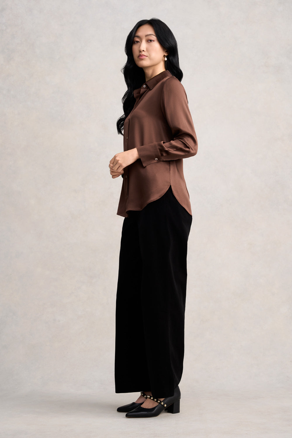 Crafted from 100% silk, this crease-resistant shirt boasts an oversized, long-line fit in a rich Coffee hue. Luxuriously soft with subtle stretch and a lustrous finish, this shirt is perfect for special occasions or a chic night out. Designed with effortless sophistication in mind, it drapes beautifully for a refined yet relaxed look.