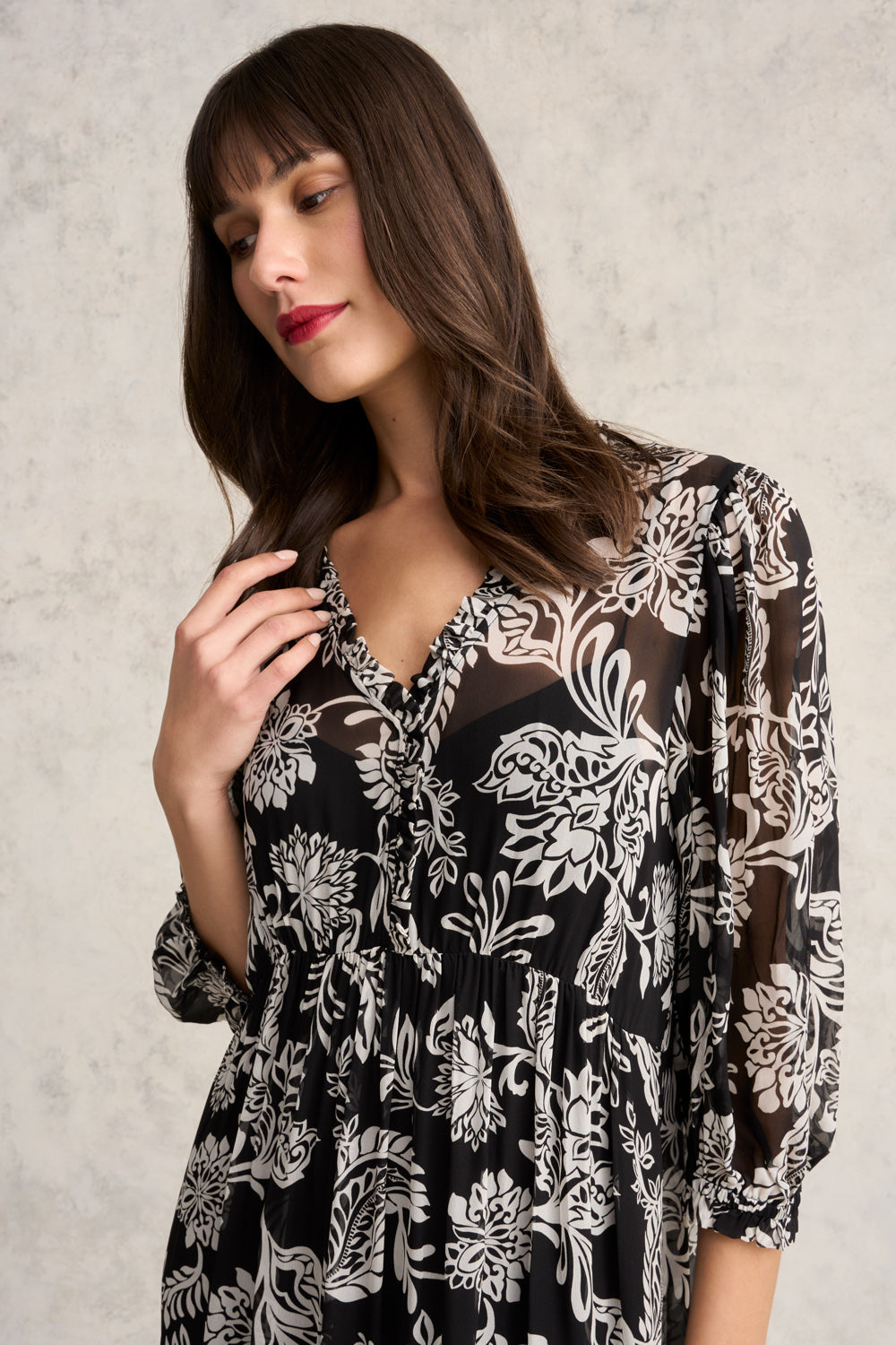 Our love-forever Printed Tiered Dress is back and now available in Coco Floral. This midi-length dress boasts a V neckline with ruffle detail, ¾ sleeve and beautiful gathered tiers. This is an eye-catching piece will soon be on high rotation in your wardrobe.