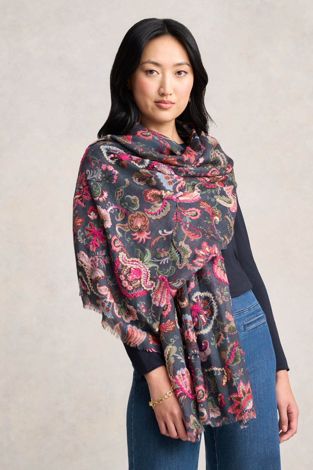 Elevate your winter wardrobe with the Embellished Paisley Wool Scarf. Made from 100% soft wool, it features a classic paisley design brought to life with subtle sequin embellishments for a touch of sparkle. The multicolour palette adds richness and warmth, making it a standout accessory that’s both cosy and chic.
