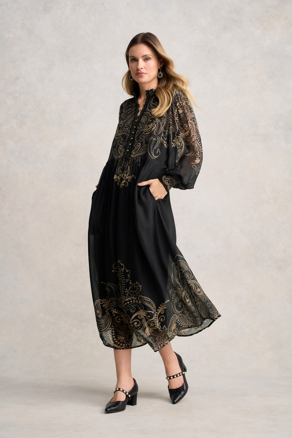 A statement in subtle sophistication, this midi-length dress features a striking Paisley Border print in rich gold and black. Designed with a stand collar and front placket finished with elegant dome buttons, it offers a refined silhouette. The long blouson sleeves with gathered shoulders and shirred cuffs add soft volume and movement. A shirred back waist provides a flattering fit, while functional side pockets and an adjustable black slip ensure comfort and versatility.