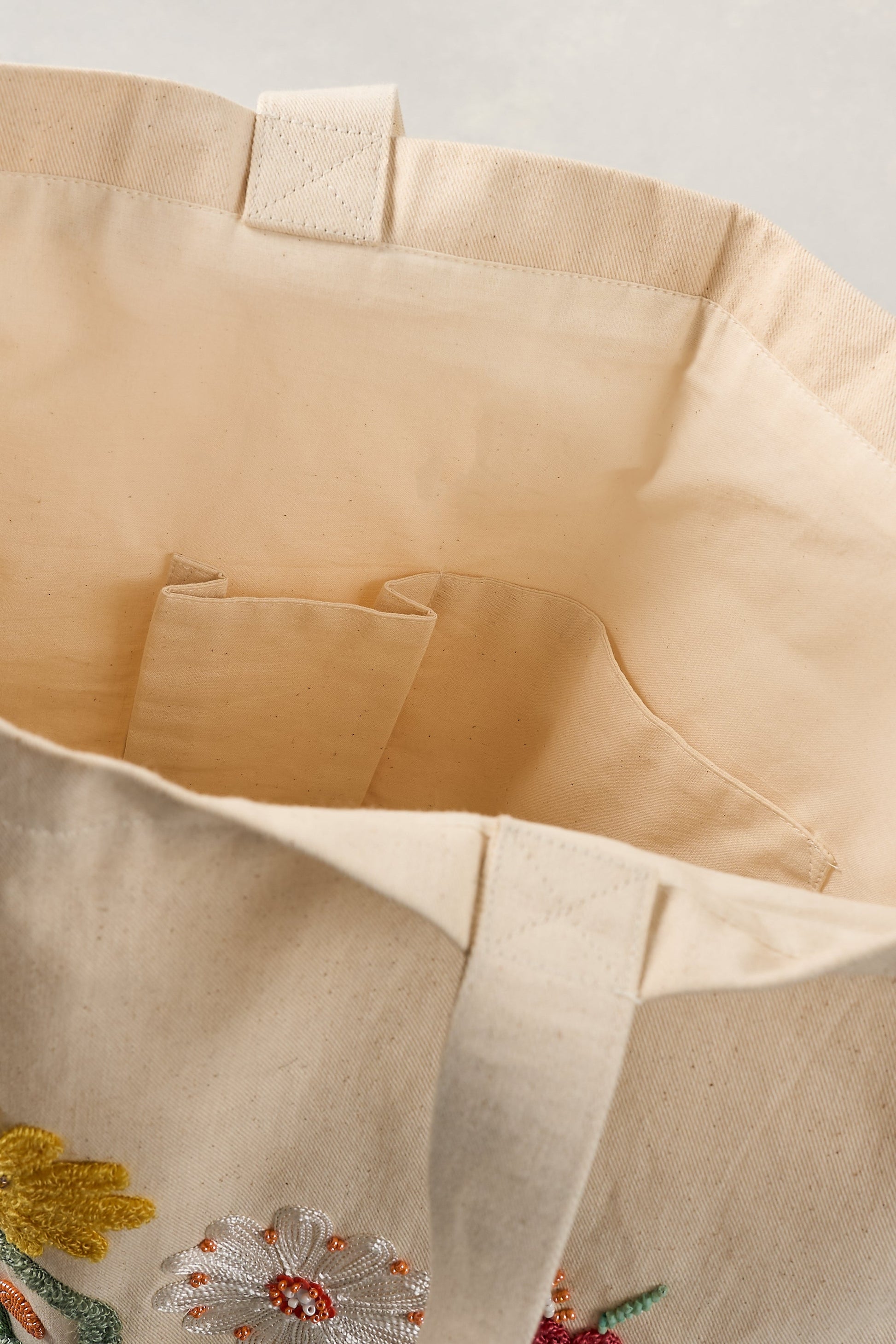 Art meets functionality in this statement tote. Hand-embellished with beading and embroidery, it features a striking floral motif on a cotton base. Perfect for market mornings or gallery afternoons — it’s your wearable masterpiece.