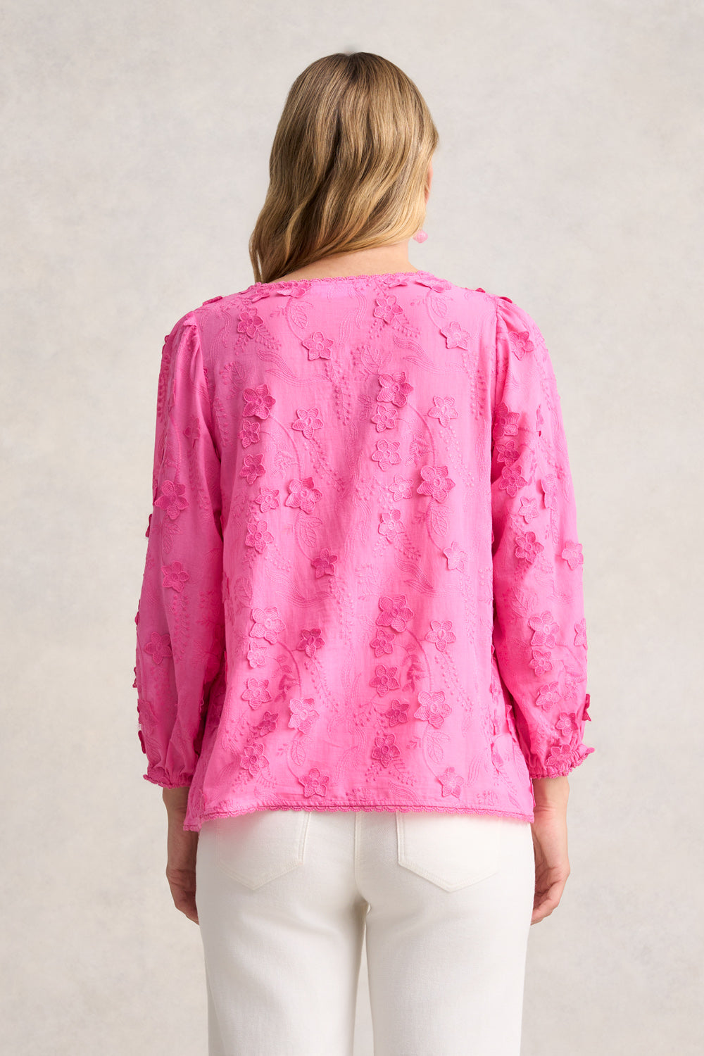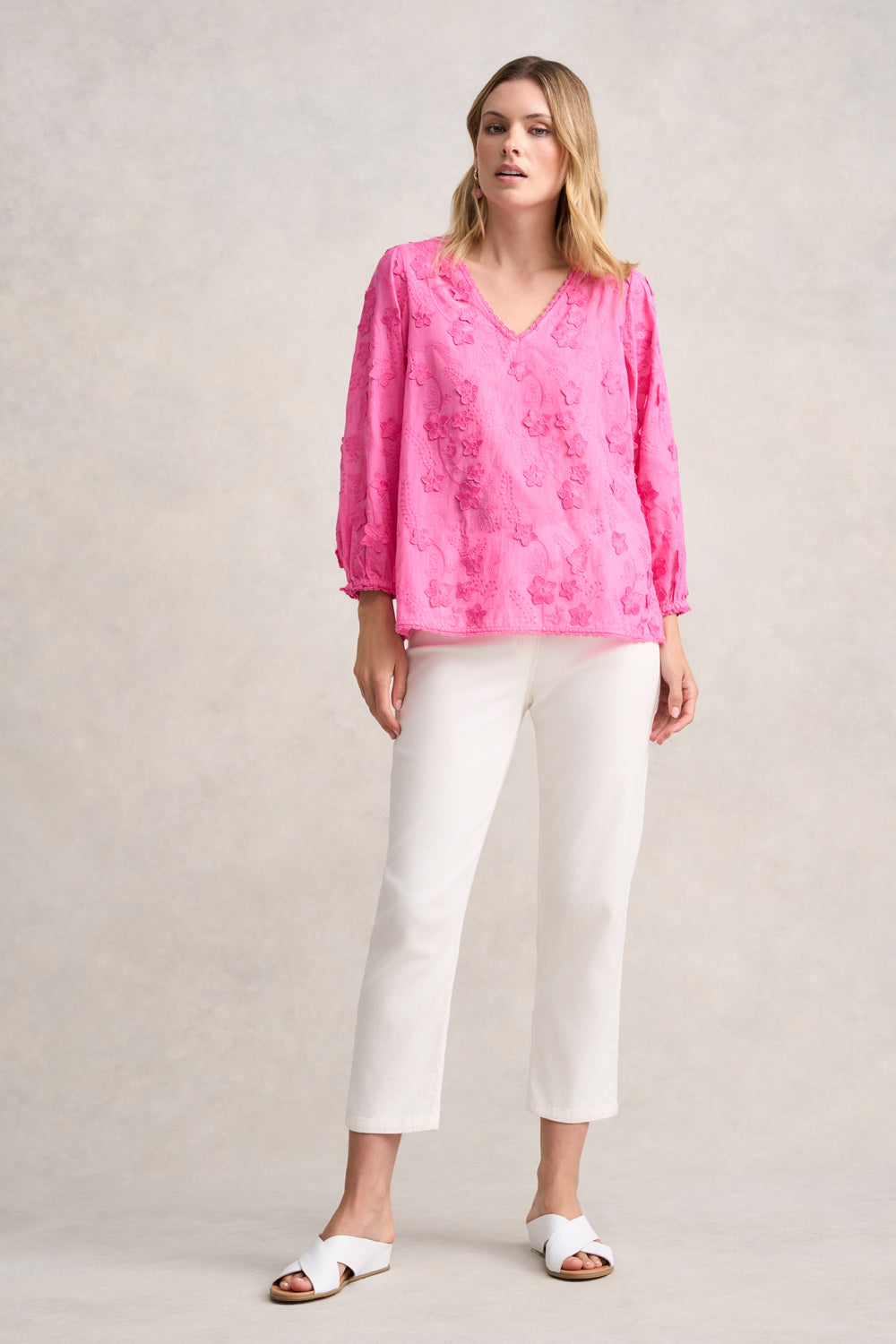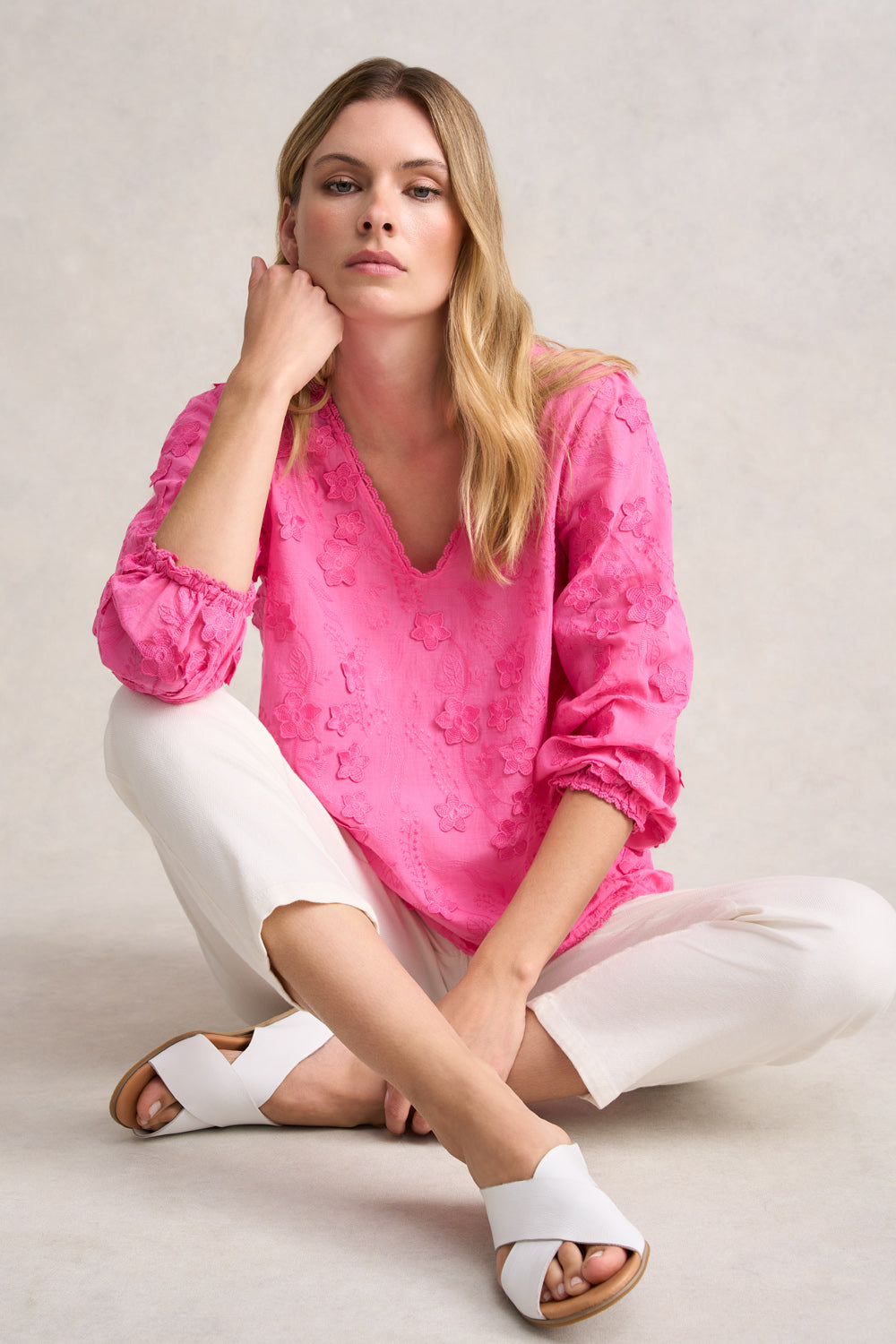 Our Lace Trim Embroidered Top is back in playful Vivid Pink. Details include a relaxed fit, V neckline and all over 3D floral embroidery. A simple silhouette with sweet touches including pretty lace trim, this style has been inspired by elegant, feminine style.