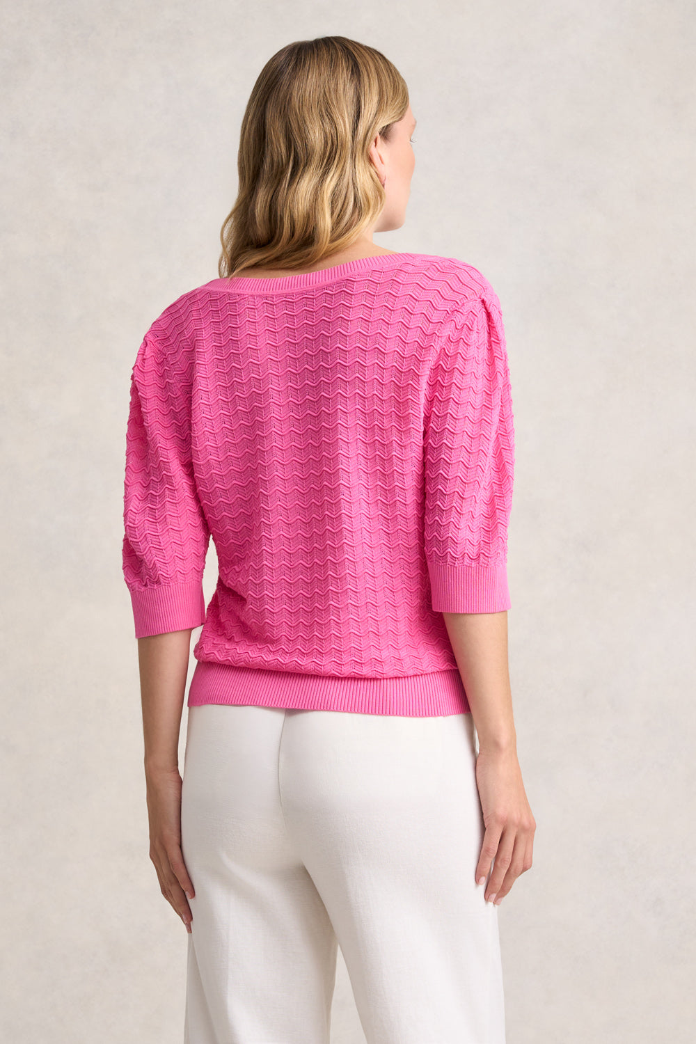 Elevate your style with our Short Sleeve Texture Knit in brilliant Vivid Pink. This comfortable top features a textural zig zag design and neat fit. Pair it with a pair of fabulous Wide Leg Jeans for effortless contemporary outfitting.
