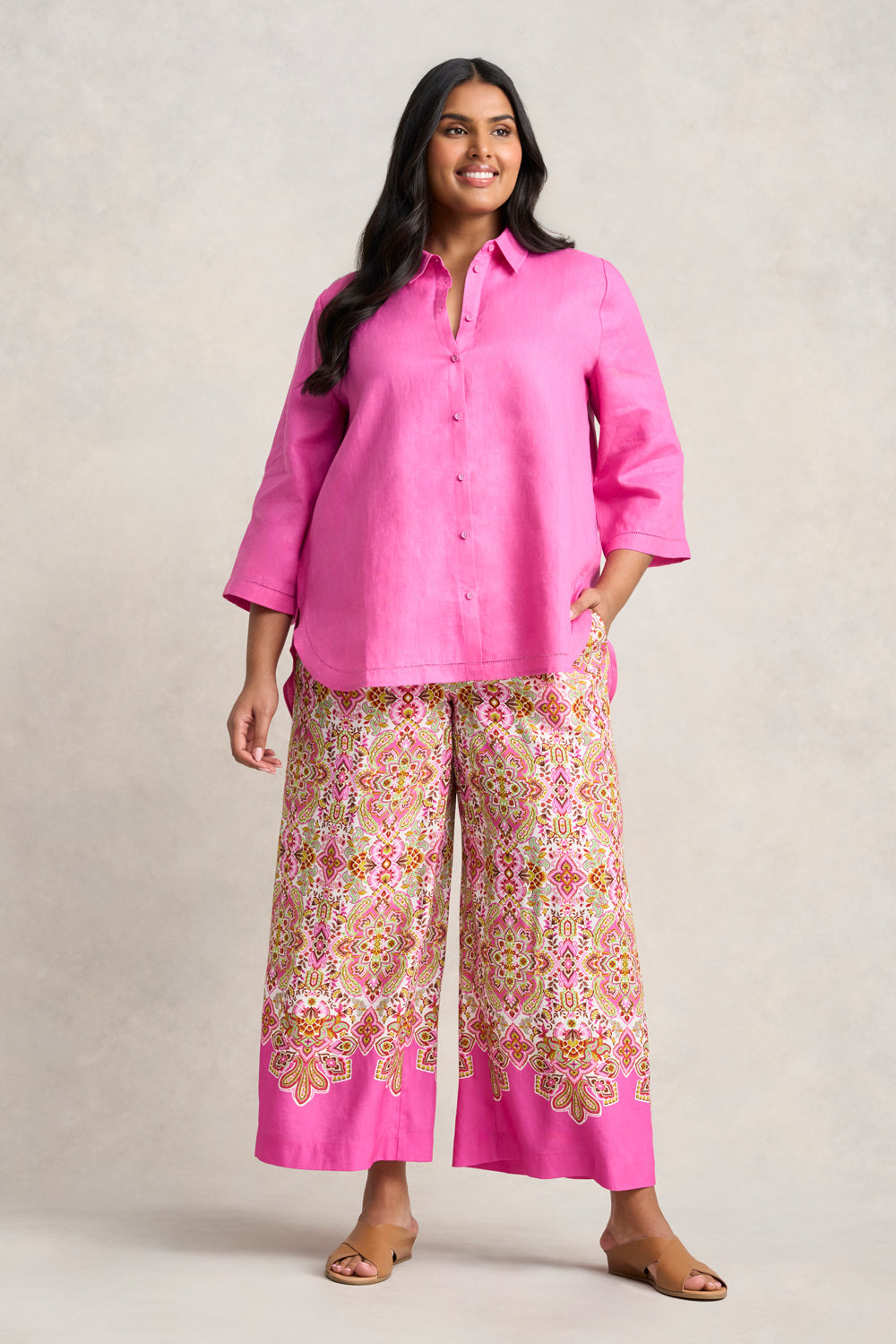 This daring shade of Rose Pink will add a refreshing pop of colour to your wardrobe. Featuring classic shirt details with a twist, this shirt is crafted from 100% French linen. Sweet picot detailing adorns the collar, sleeve and hem and the ¾ sleeve is perfect for warmer days. We love the curved high low hem which gives a flattering finish.