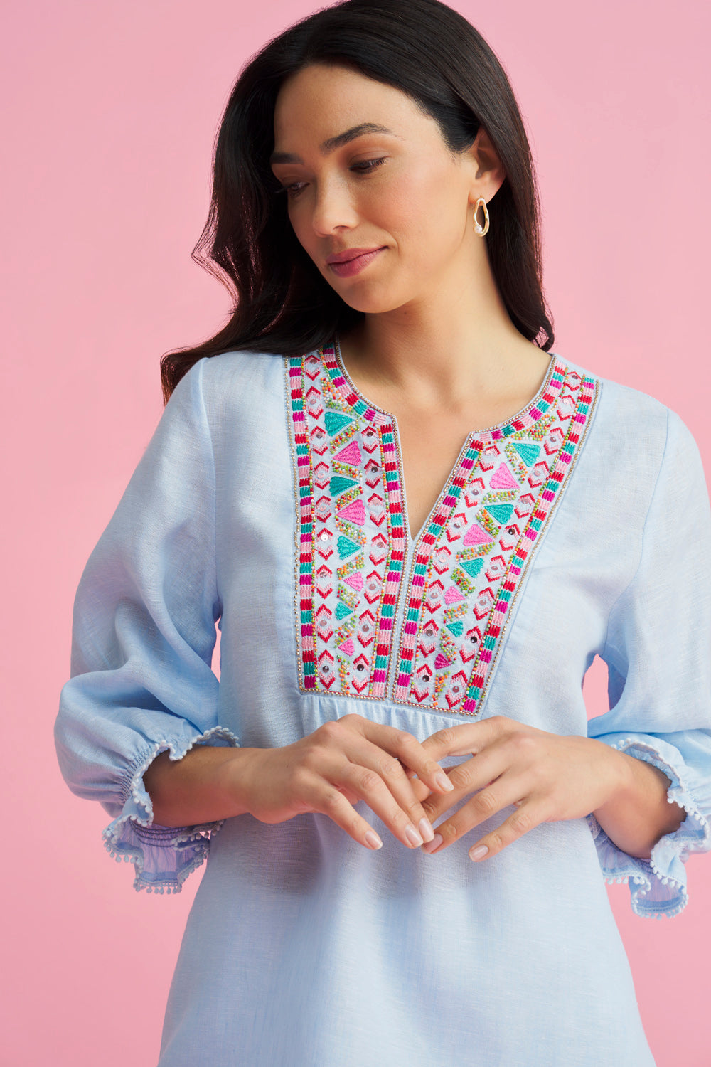 This tunic exudes charm and sophistication with its intricate embroidery including sequin, beads and multicolour thread. The notched neck, soft gathering and side splits contribute to the graceful silhouette complemented by a ¾ sleeve with elasticated cuffs. Complete with a cute lace trim along the sleeve, this summery tunic pairs perfectly with our classic Bengajean®.