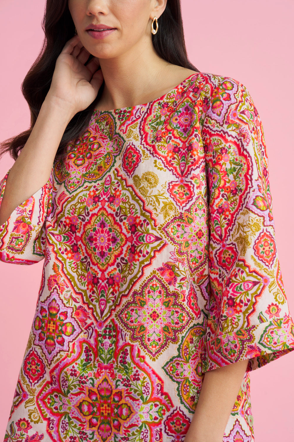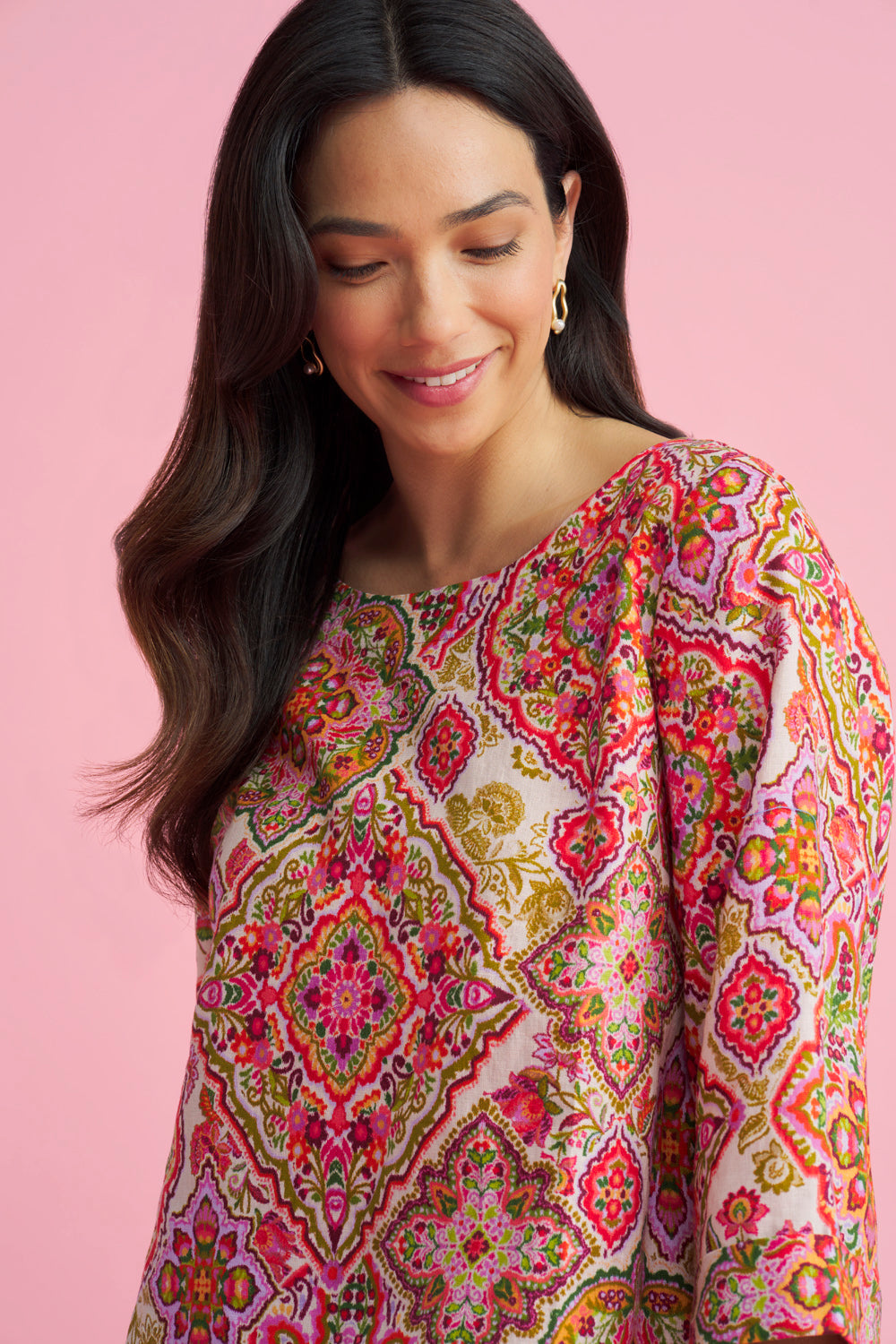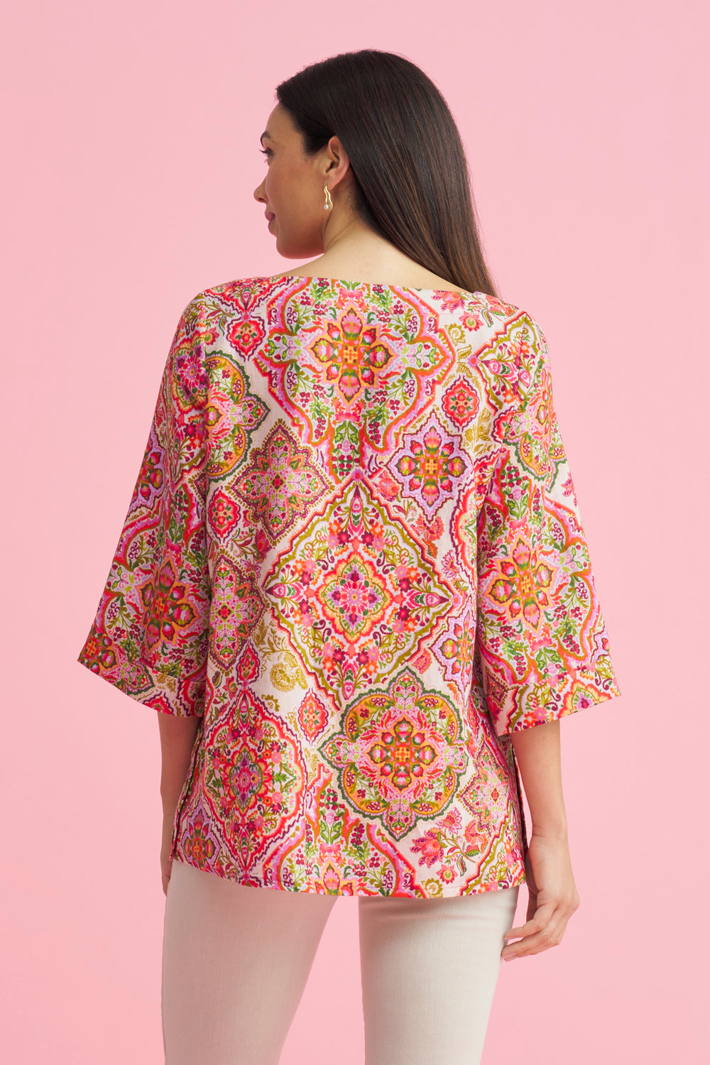 Summer est ici so cue the new holiday prints! Here our 100% French Linen Button Detail Top features the joyous Pink Tile print. Comfortable, breathable and lightweight, this top has a wide scoop neckline, chic side button detailing and a turn back cuff.