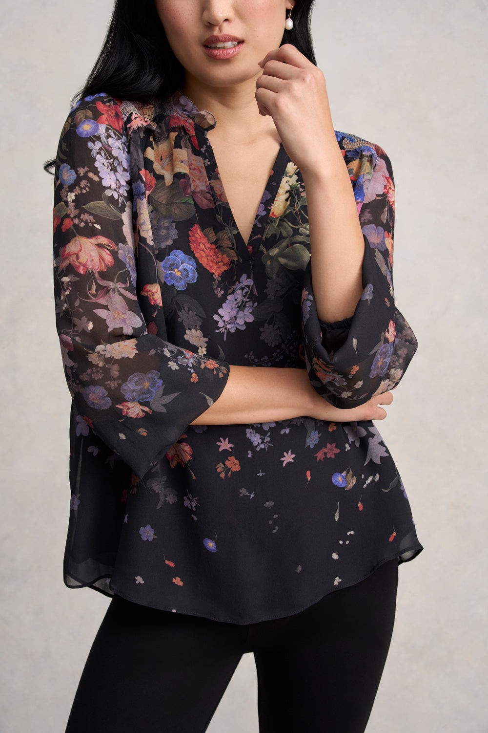 Say enchanté to this beautiful blouse featuring the romantique Midnight Floral print. Crafted from lightweight viscose georgette with a notch neckline and feminine frill details, this blouse is lined through the bodice and offers a comfortable relaxed fit. It’s desk to dinner fashion made très chic.