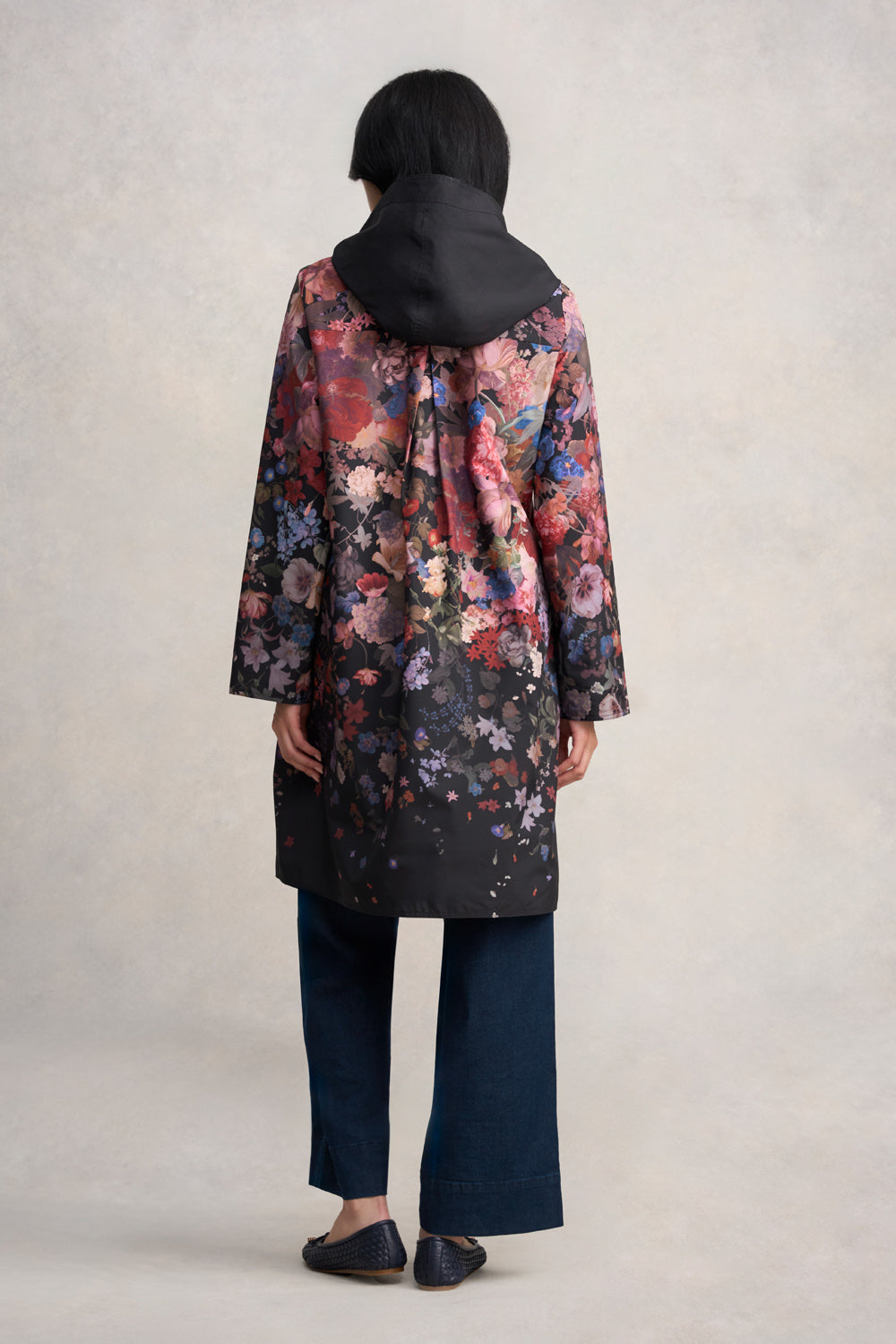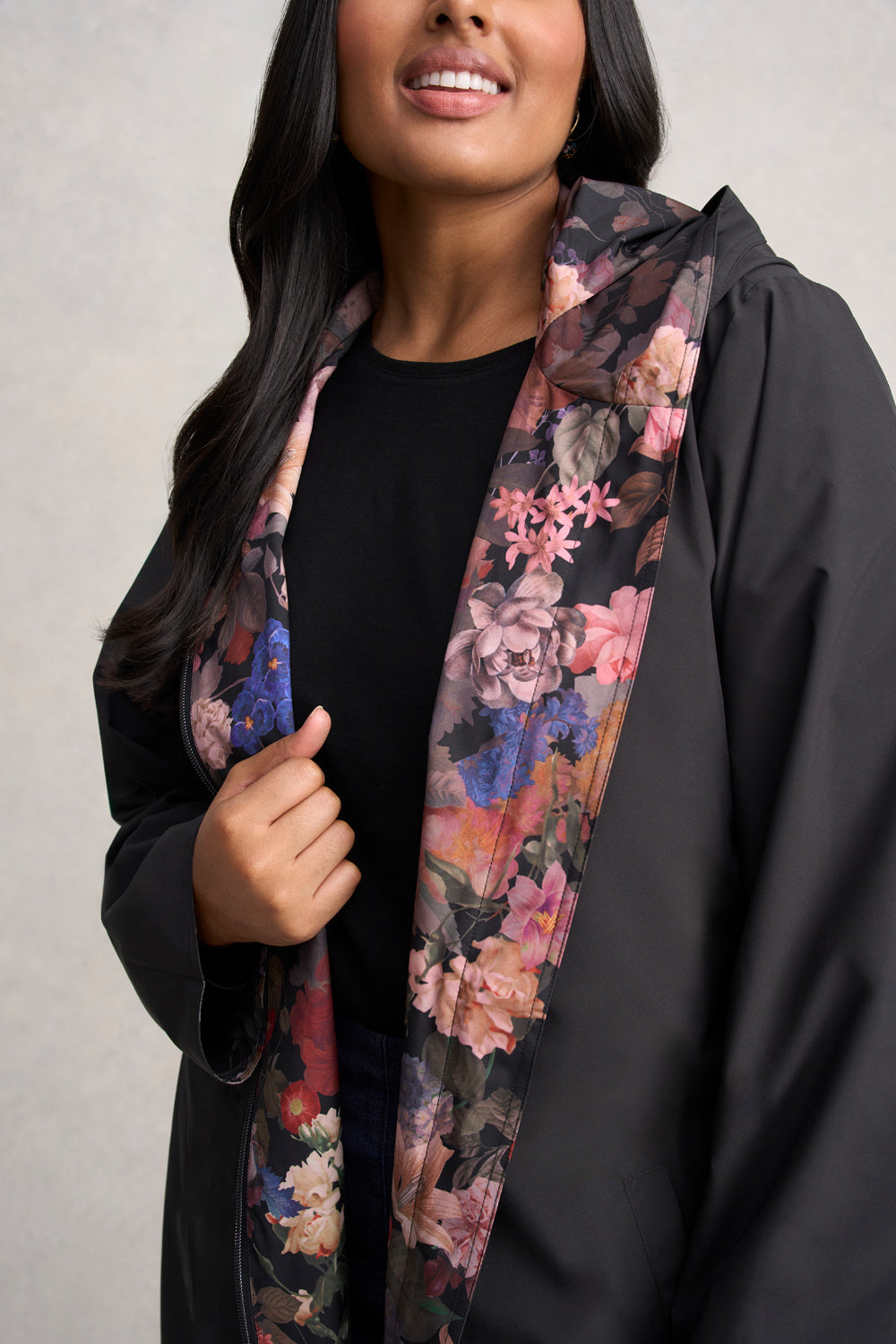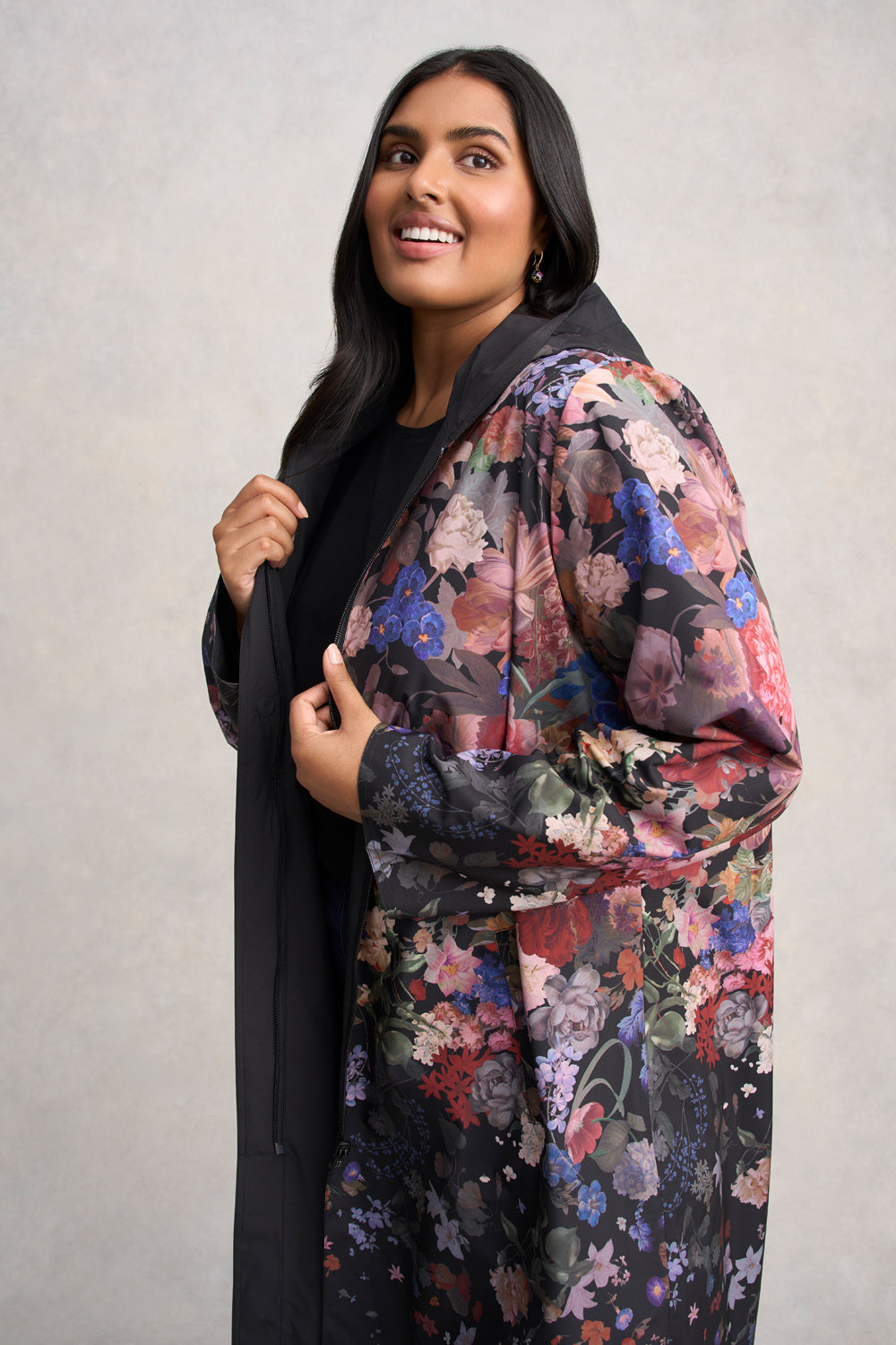 Let the rich colours of our Printed Reversible Raincoat complete your winter look. Crafted from shower resistant fabric, this hooded coat features both zip and snap button fastening. Offering excellent coverage for wet days, choose to show off the stunning Midnight Floral print or wear it with classic black on show.