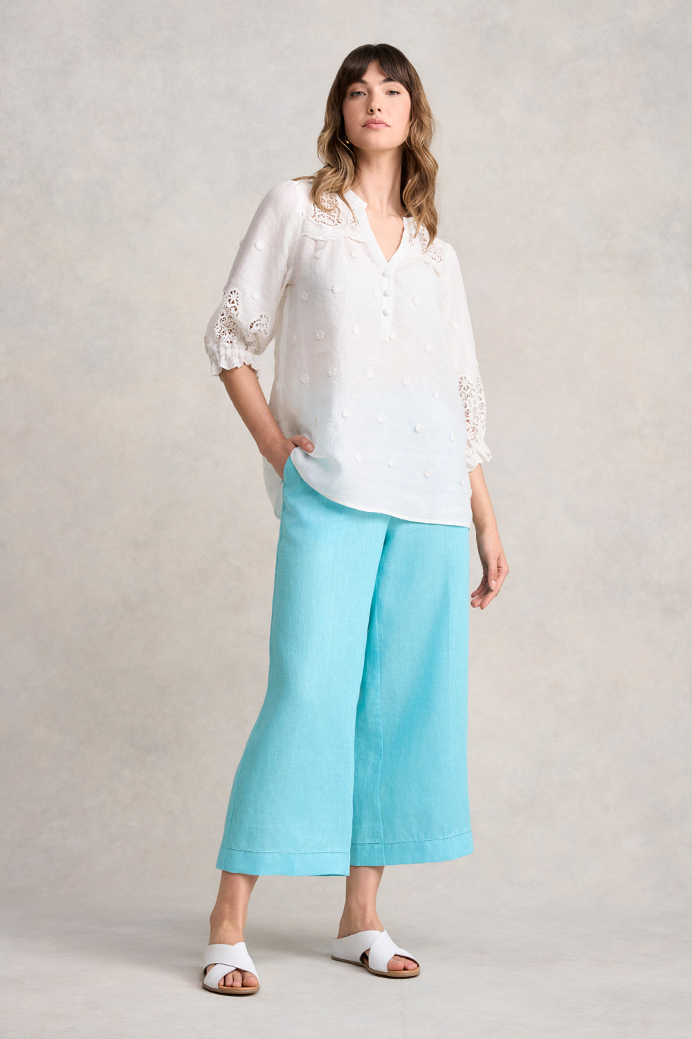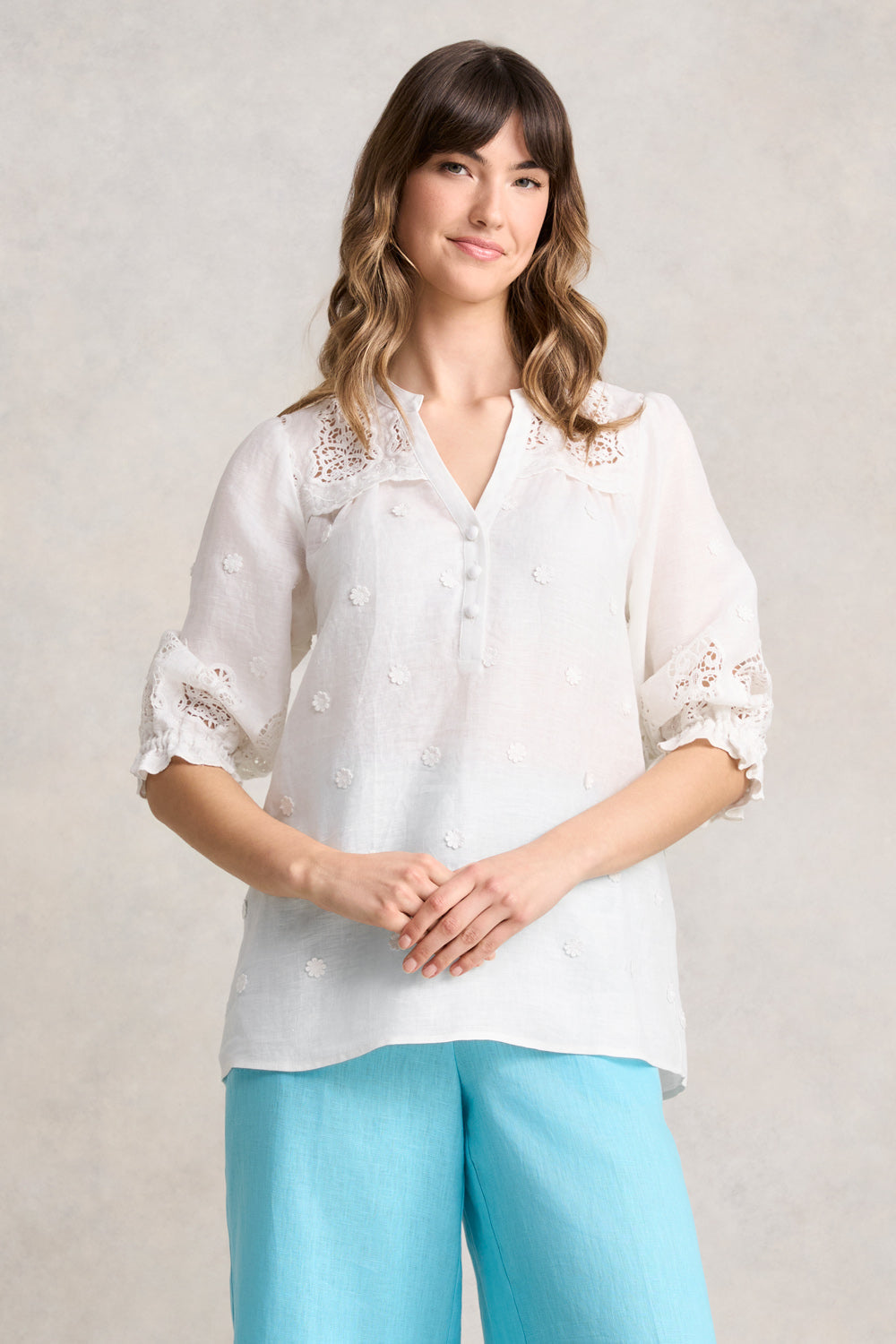 Indulge in the elegance of our Jane and Serge collection with our Lace Embroidered Linen Top. Crafted from 100% French linen and featuring gorgeous cut-out embroidery on the yoke and lower sleeve, this breezy 3/4 sleeve top is the perfect blend of dainty detail and easy comfort.