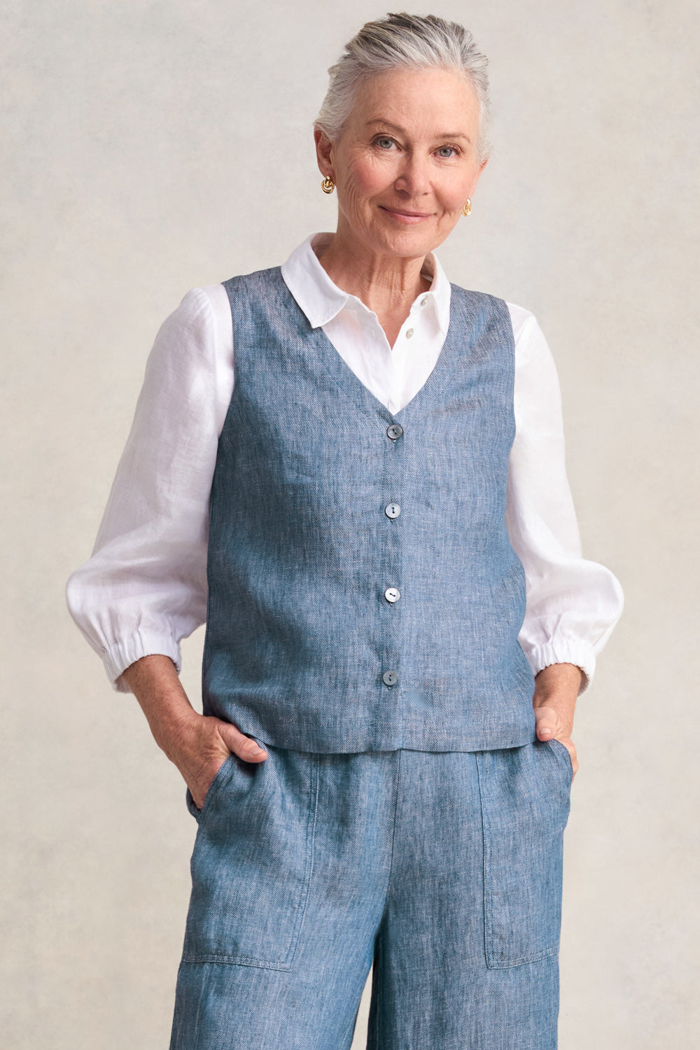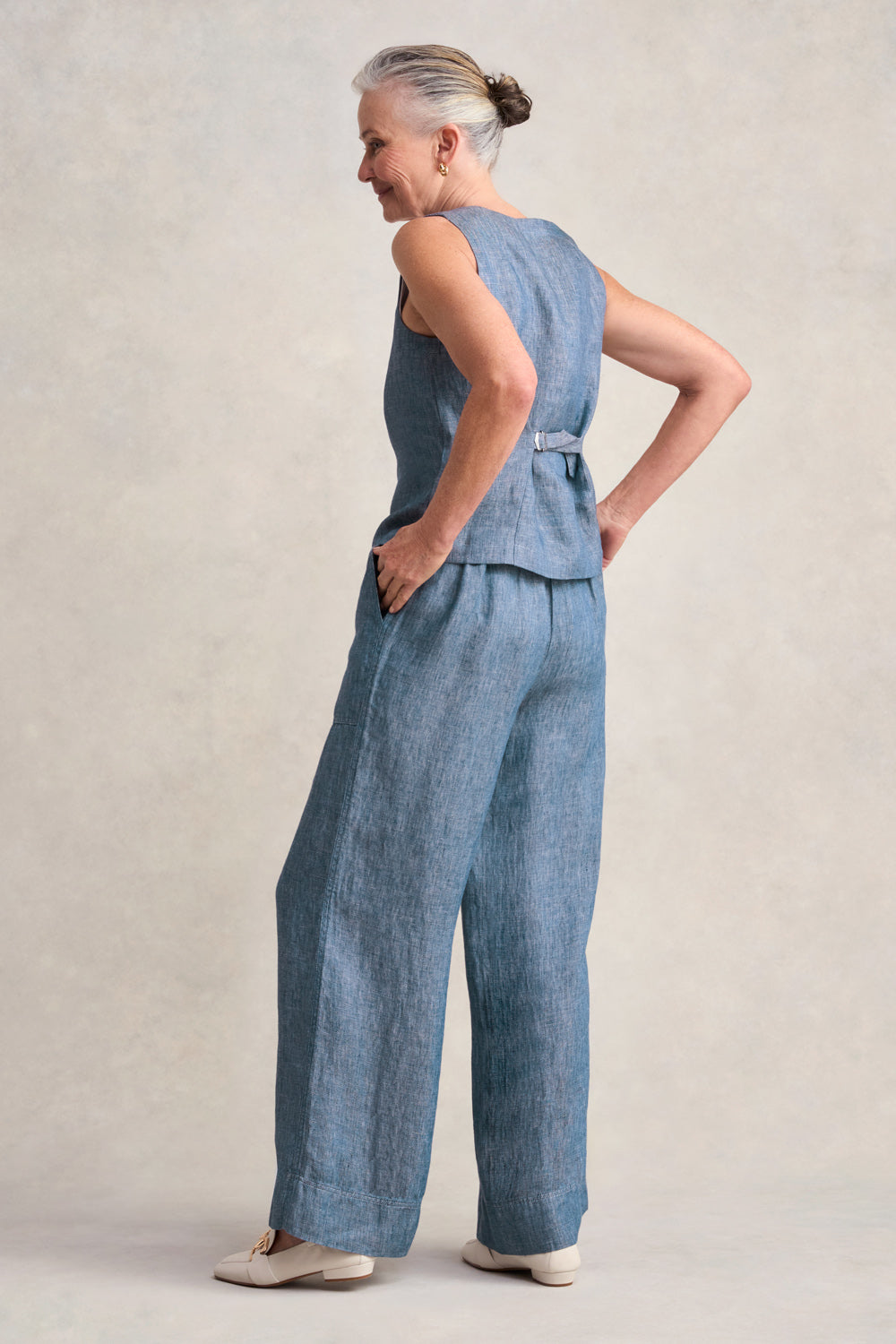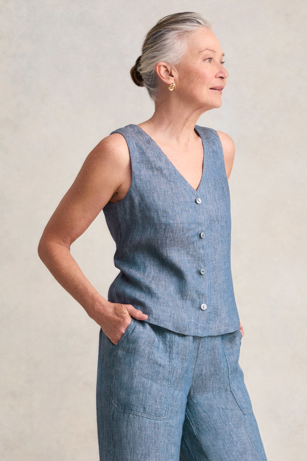Embrace the joy of dressing with this trendy vest. In a classic shape, it features a V neckline, tonal resin buttons and an adjustable back belt which offers a versatile fit allowing you to cinch in the waist or wear it more relaxed. Crafted from a hemp linen blend in Indigo Twill, pair this vest with our matching pant and a white shirt or, for warmer days, opt for a white sleeveless tank.