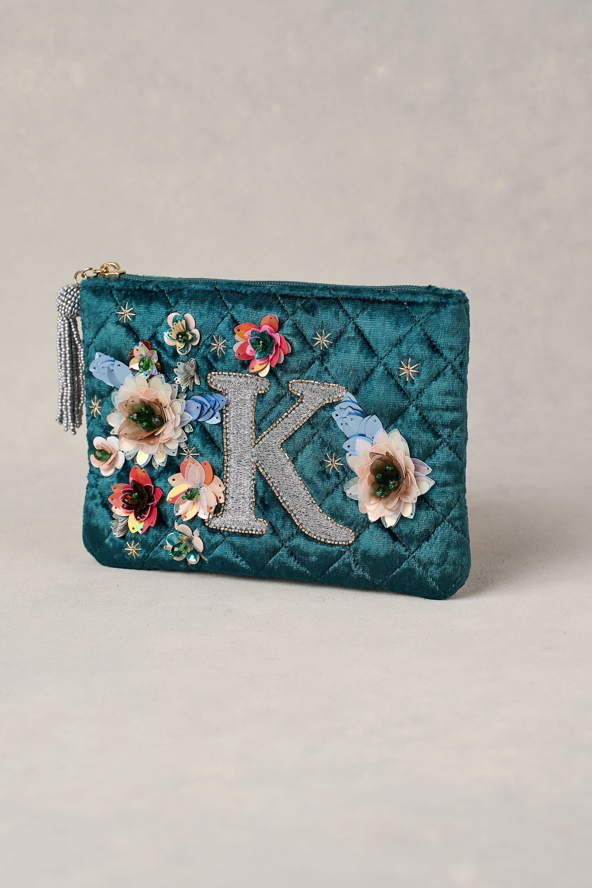 Take your cosmetics with you wherever you go in this personalised ‘K’ monogram cosmetic bag. Featuring a beautiful 3D floral design embellished with seed beads and sequins over an emerald base, add a pop of colour to your beauty regime. This bag makes a lovely personal purchase or thoughtful gift for someone special this Mother’s Day.