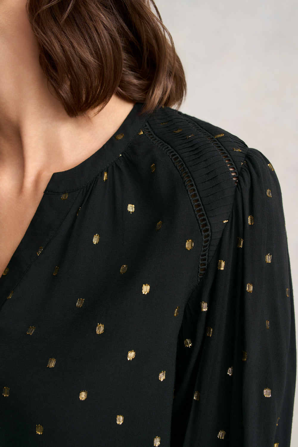 A little shimmer, a lot of sophistication — our Lurex Diamond Blouse is made for moments that sparkle. With a metallic spot jacquard, soft blouson sleeves and a gently gathered neckline, this piece brings an effortless sense of occasion to your day or night. Pair with our Le Flare Bengajean® for a contemporary bohemian look.