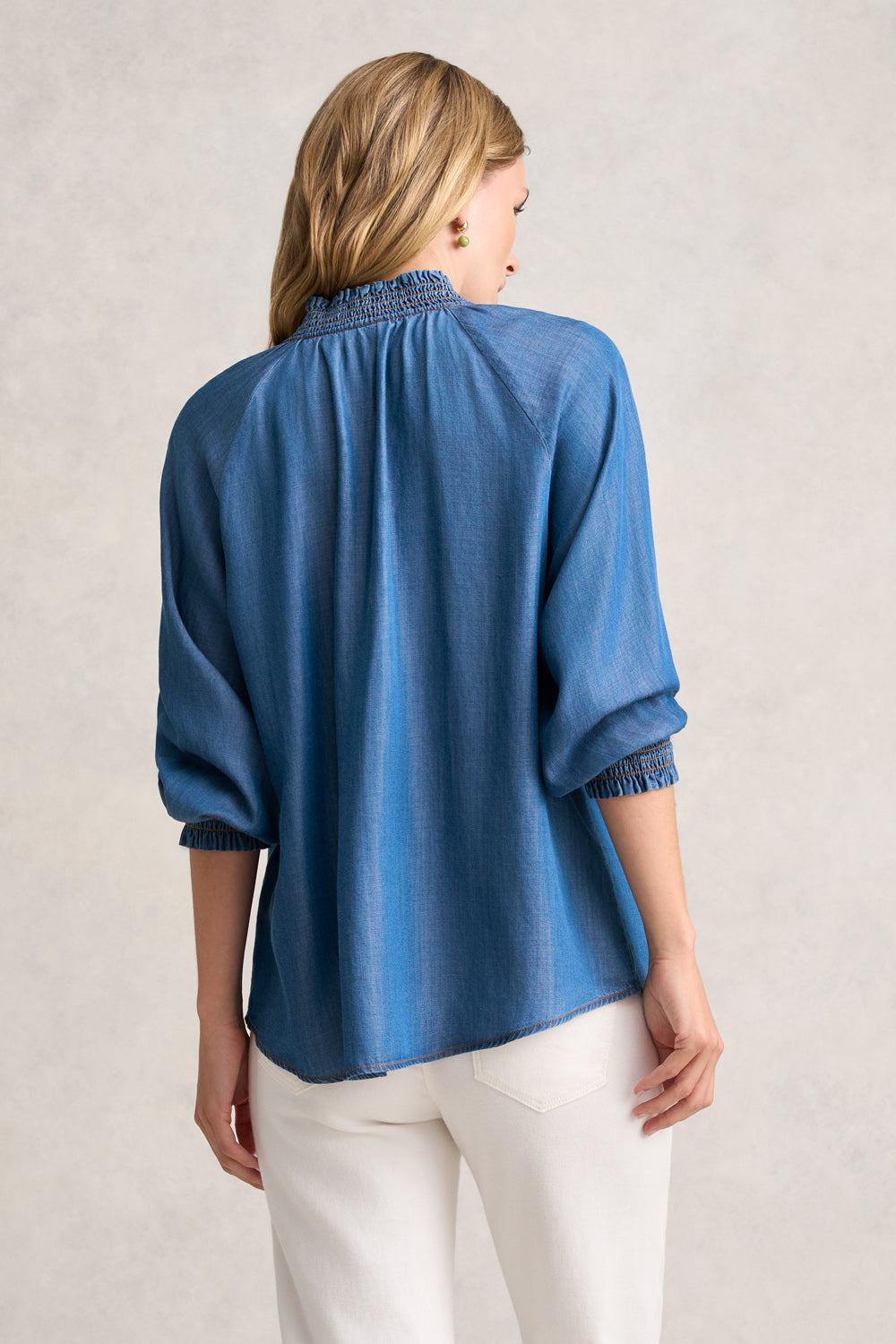 This ¾ Sleeve Chambray Shirt is an elegant take on a classic shirt style. Soft with beautiful drape, this shirt features a slight sheen, contrasting white resin stud buttons with a gunmetal grey rim and curved hem. We love the contrast stitch detail and feminine shirred cuff and collar with frill detail.