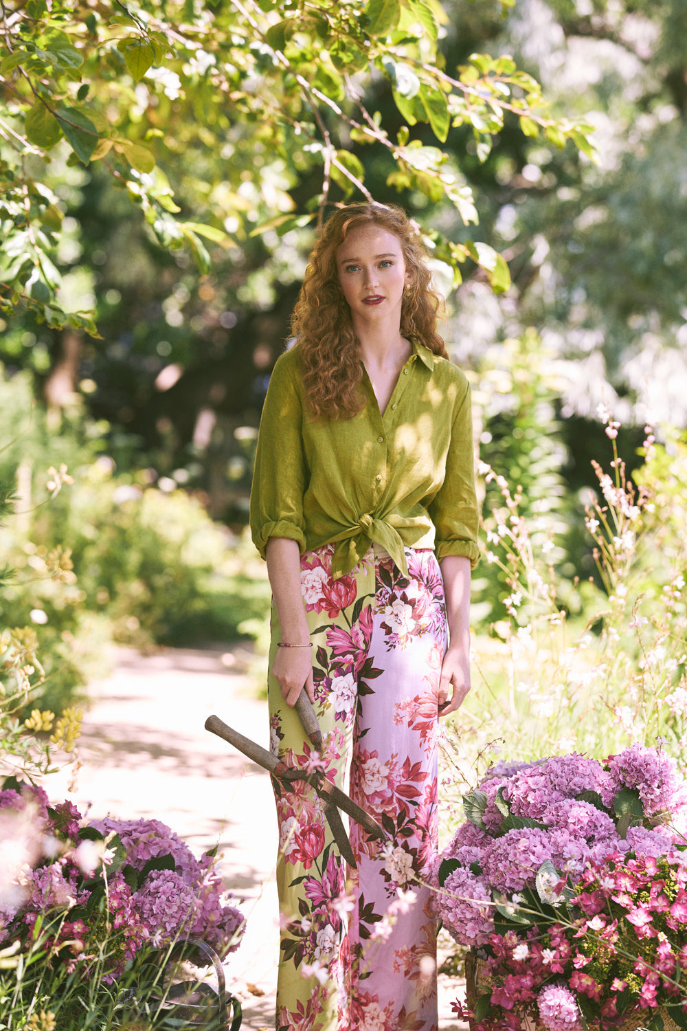 This 100% French linen shirt with engraved resin buttons and elasticated cuffs is a light and breathable addition to any outfit. As well as classic shirt details, it features intricate picot detailing along the hem and a ¾ sleeve with elasticated cuff. Available in an elegant Pear/Cross Dye, this shirt accompanies the Spliced Floral Soft Pant with ease and sophistication.