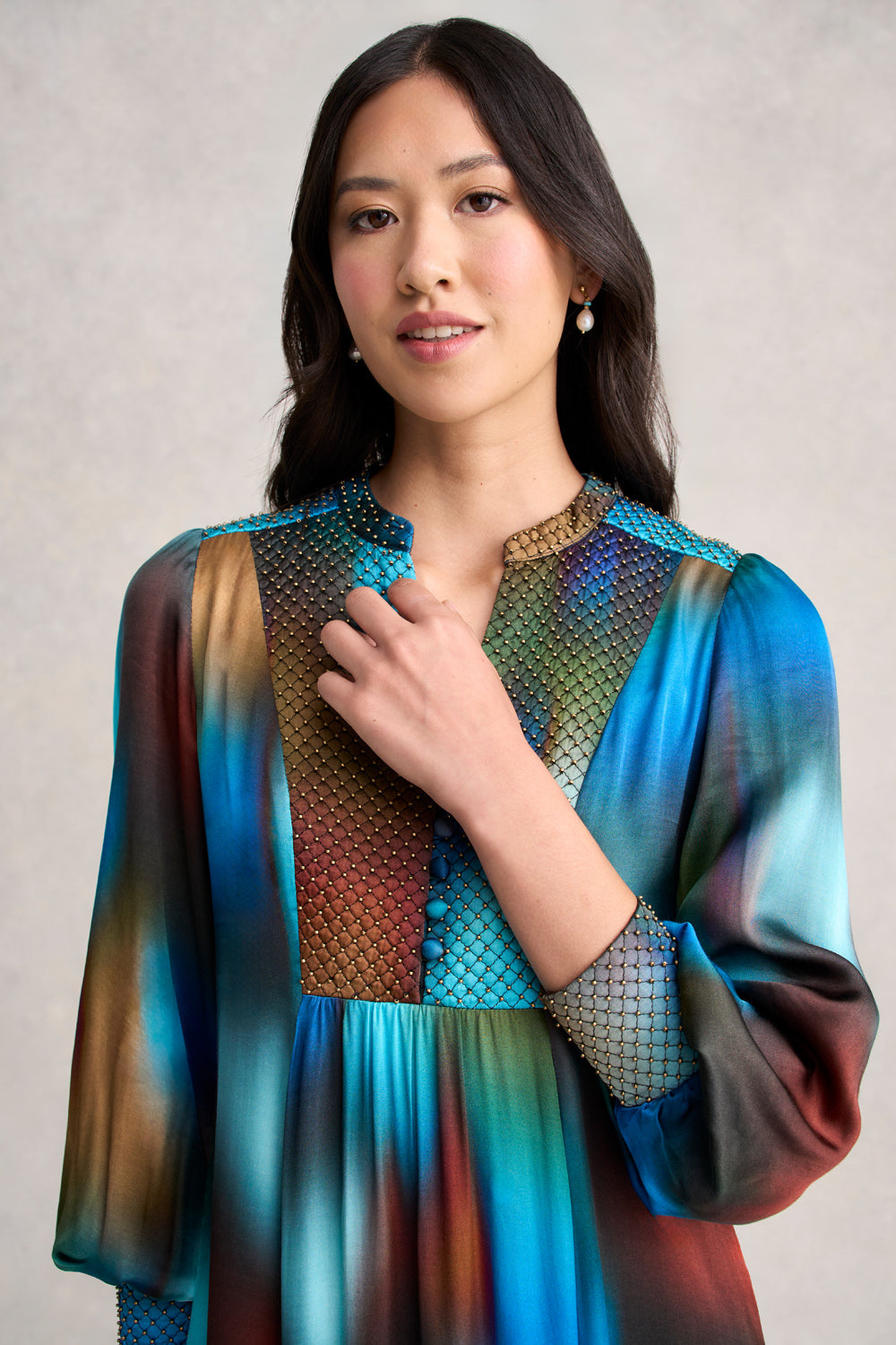 Our elegant Beaded Smock Dress, crafted from luxuriously soft viscose sateen, combines both elegance and comfort. Featuring quilted beading in bronze along the bodice, cuffs, and back, this Ombre print midi dress has a flattering flared silhouette with gathering at both the front and back. The cutaway neckline, self-fabricated buttons and side pockets add style and practicality.