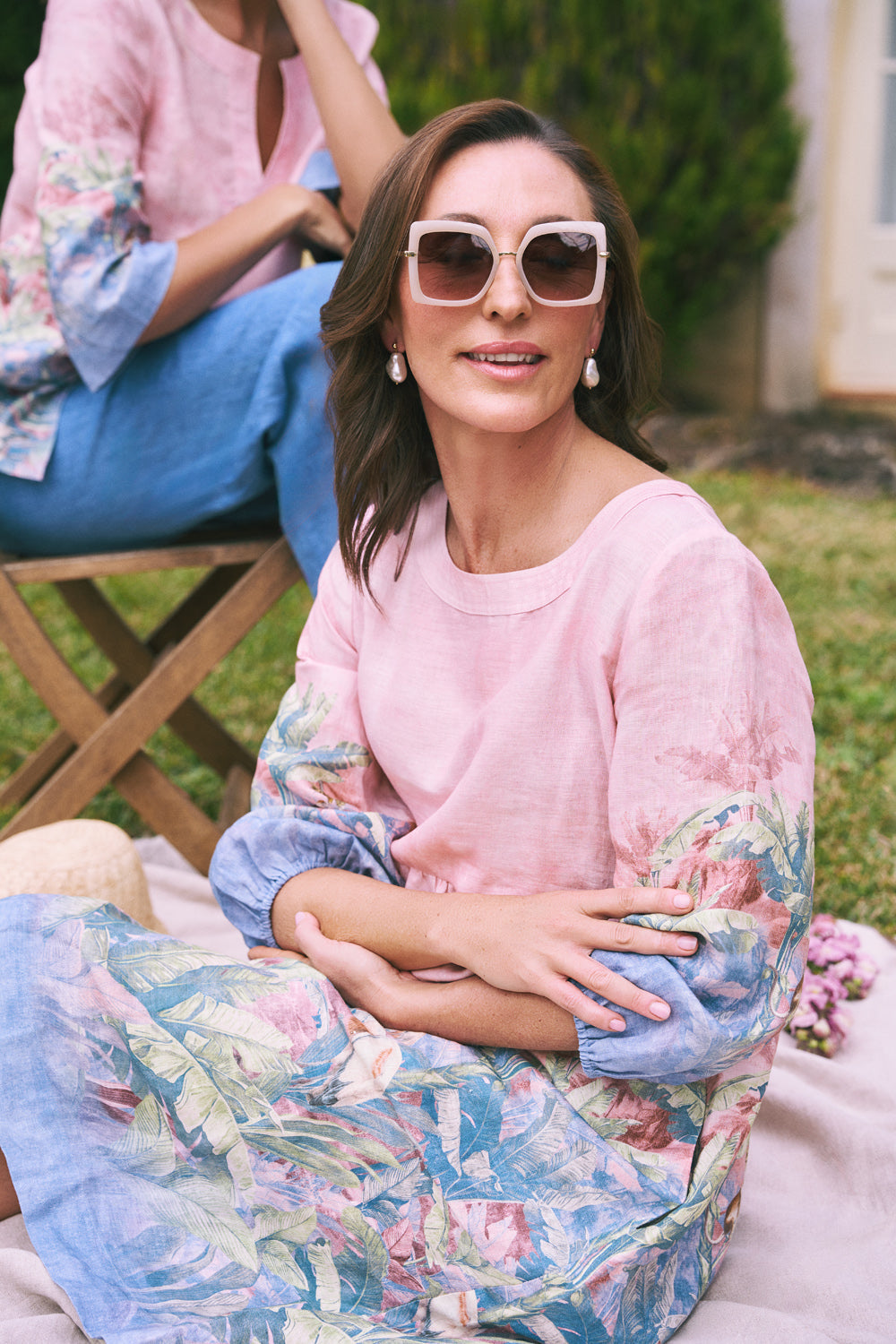 The dreamy Sunset Palms Print creates the perfect French linen dress for warm afternoons and golden light. The blouson sleeves and scoop neckline lend a feminine softness, while engraved shell buttons and side pockets add signature Blue Illusion details. Easy, elegant and effortlessly uplifting.