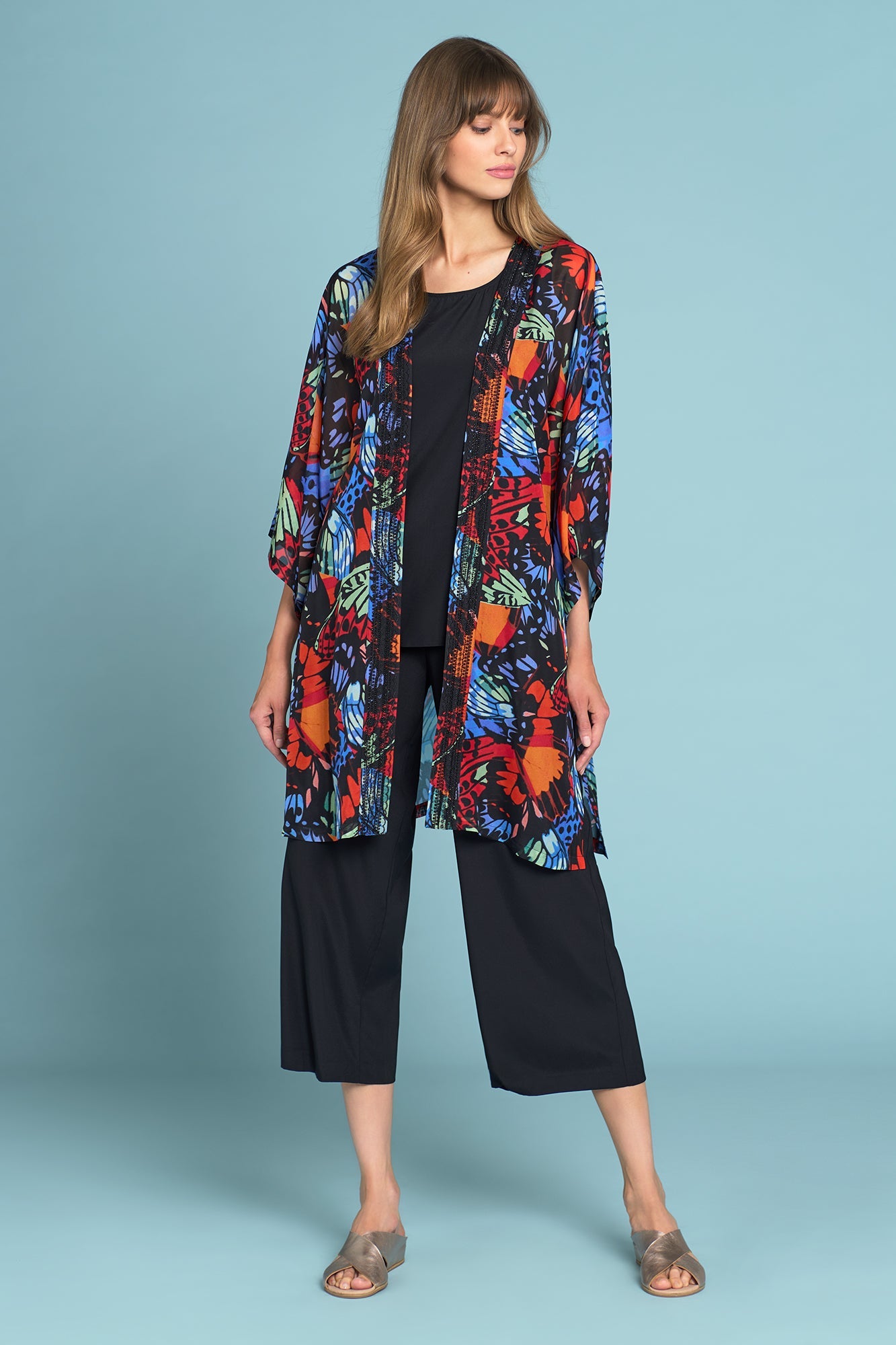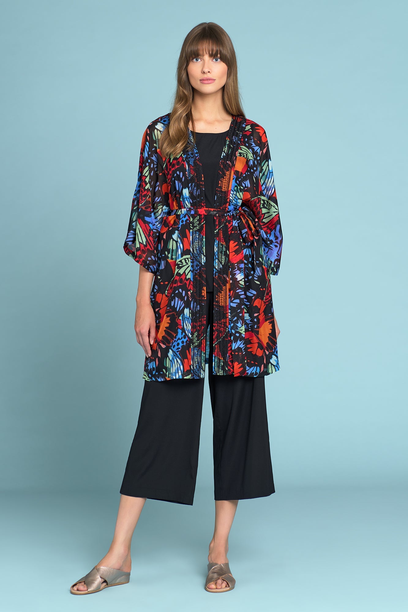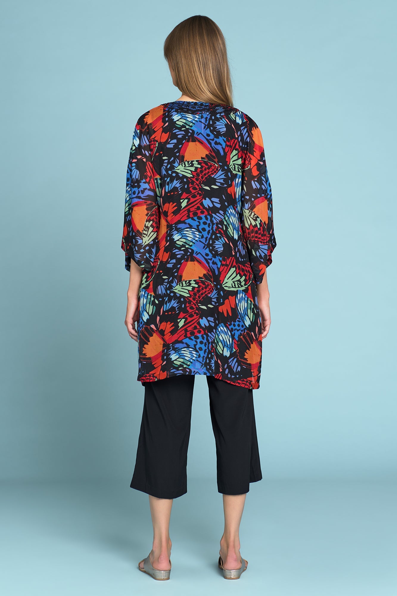 This unique, robe-style silk kimono is the latest from our Olivia Newton-John collaboration. Co-designed by Dame Olivia Newton-John exclusively with Blue Illusion, this kimono is crafted from 100% silk and features a beautiful rainbow butterfly print. Exuding a feeling of hope, this is a beautiful, limited-edition piece. Proceeds from this purchase will support the Olivia Newton-John Foundation, an independent charity sponsoring global research into alternative cancer treatment.