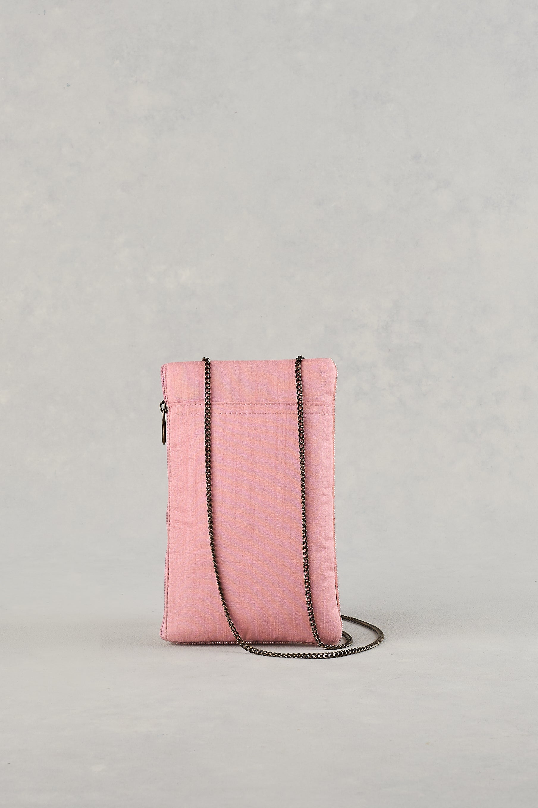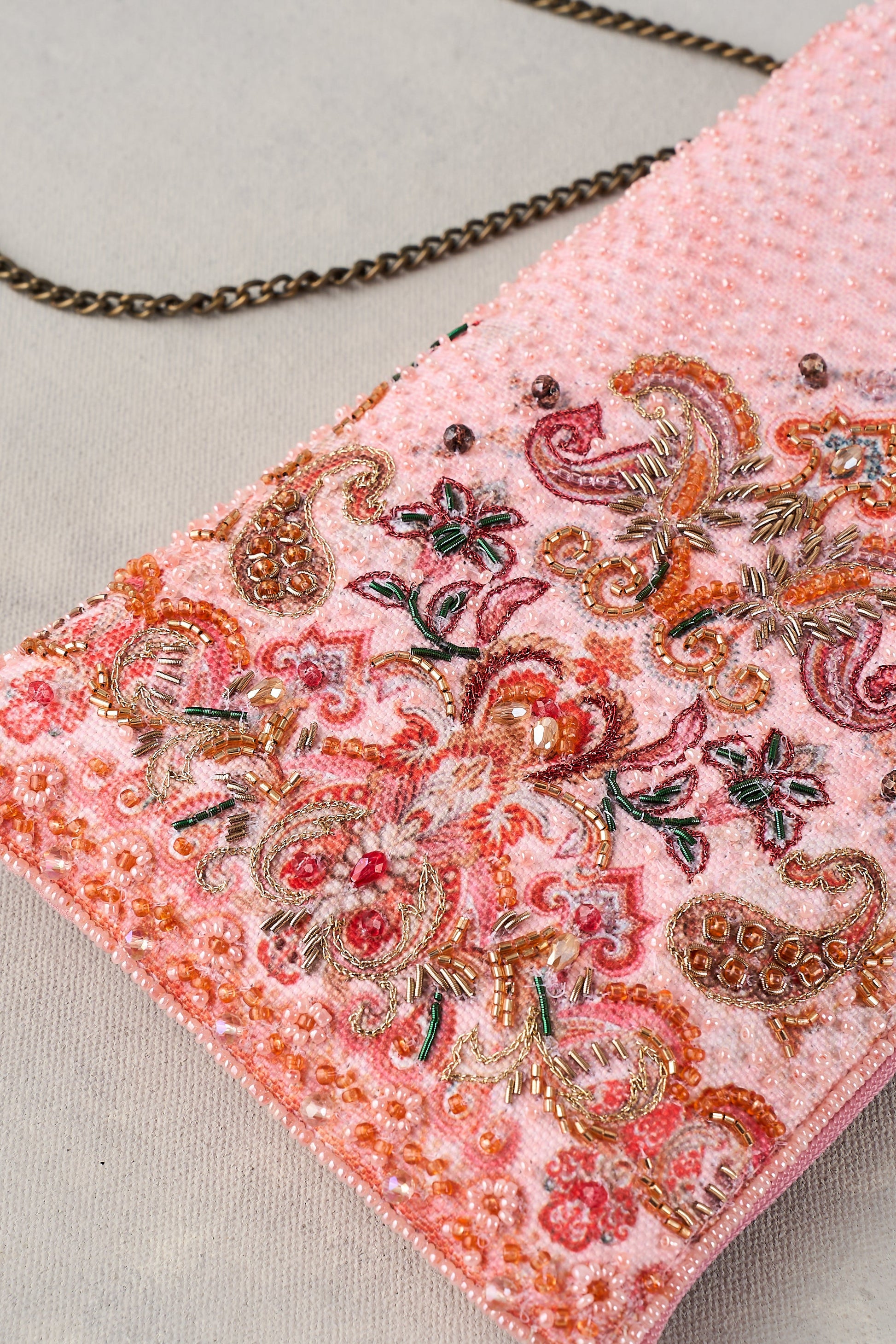 Intricately adorned with beading and embroidery, this pink paisley clutch brings vintage charm to modern styling. Petite yet poised, this bag makes a graceful statement. while the brass chain and magnetic closure offer hands-free ease for soirées or days when elegance travels light.
