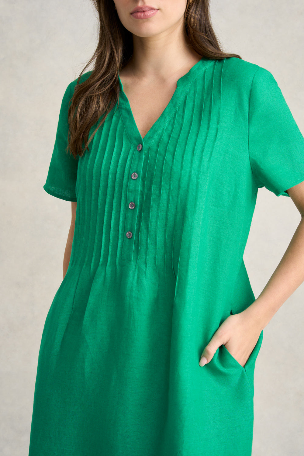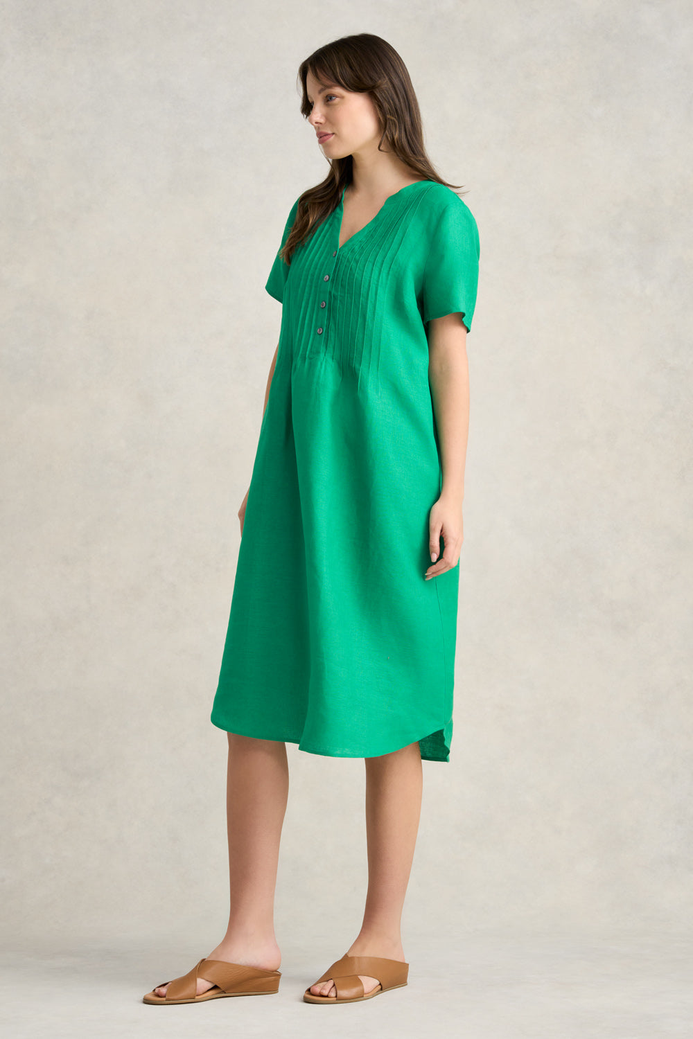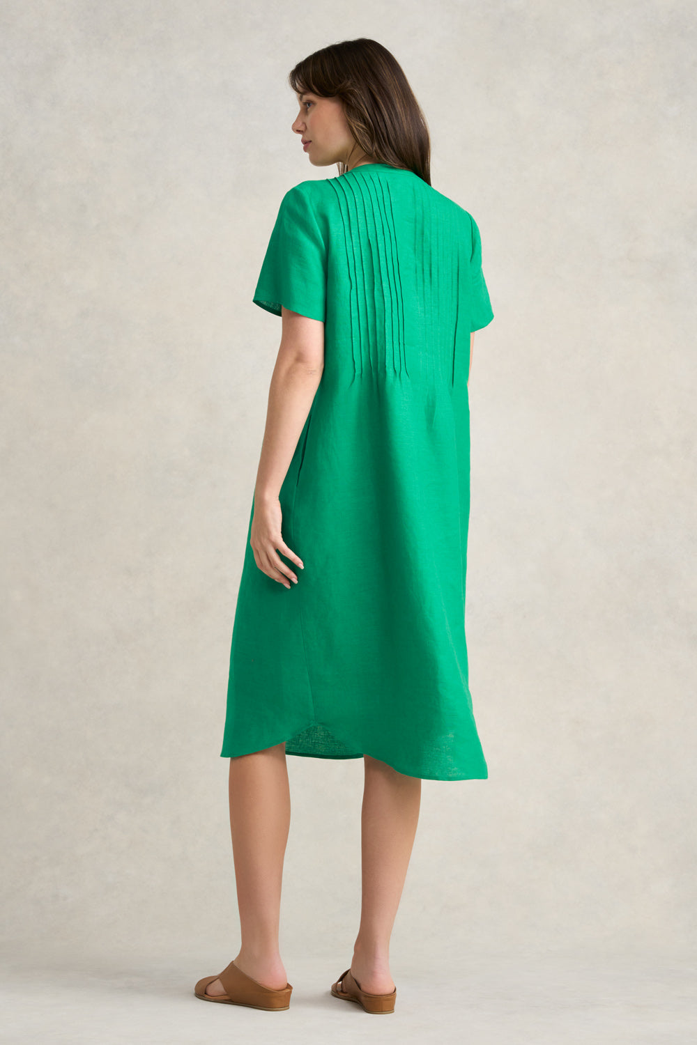 Instant style will be yours in this gorgeous Pleated Front French Linen Dress in Vibrant Green. Linen lovers will appreciate the breathability and comfortability of this midi-length dress as well as its flattering cutaway neckline and pintuck details. Spend a lazy summer day en style.