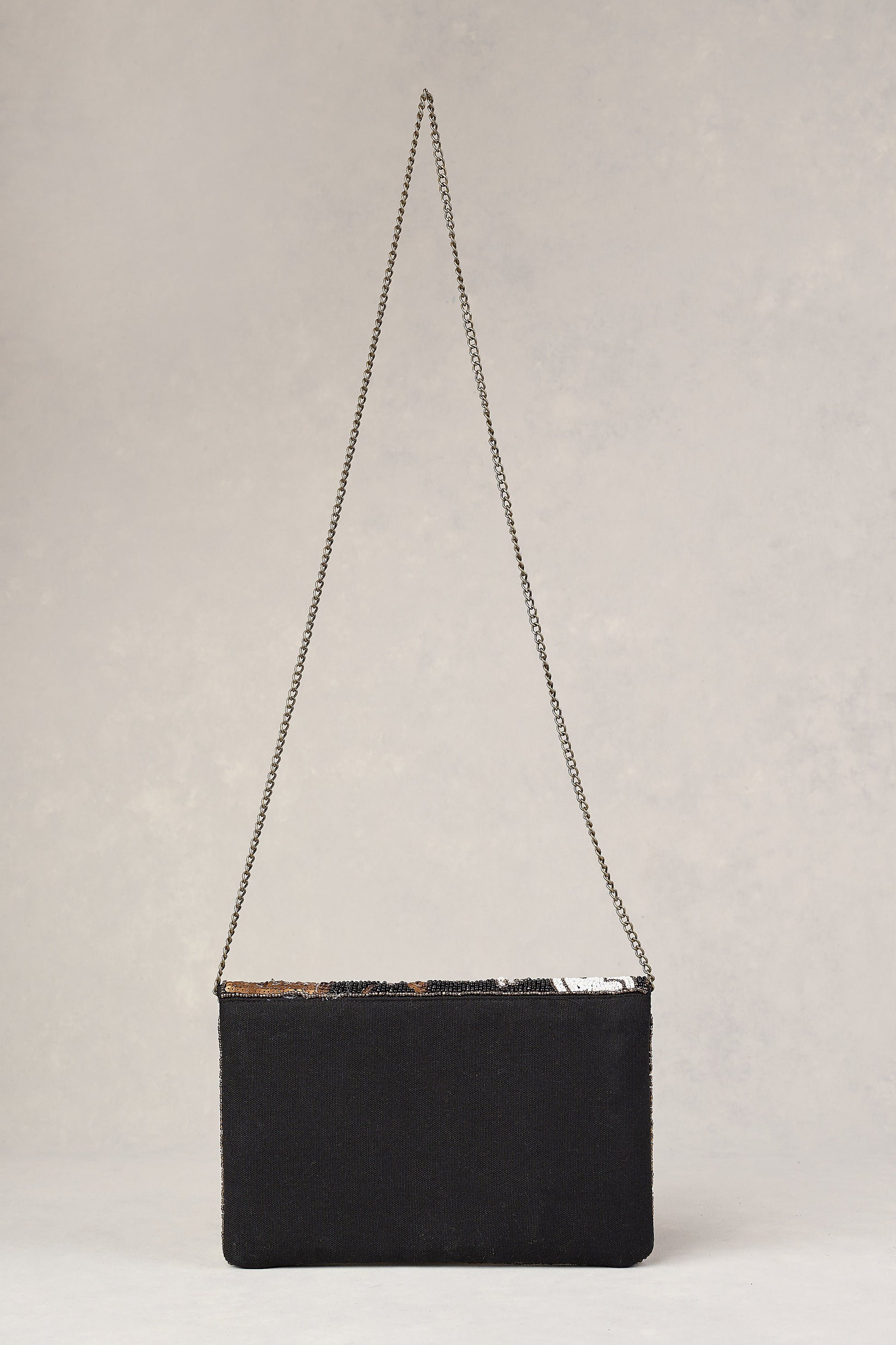 Create a sparkling contrast to your look with the embellished design of our Sequin Paisley Clutch with copper accents. Adorned with sequins and seed beads to create floral and paisley motifs, there is no shortage of visually striking details on this accessory. The magnetic clasp means your belongings will be safe and the antique gold shoulder chain offers versatility. Styling this statement accessory is a treat.
