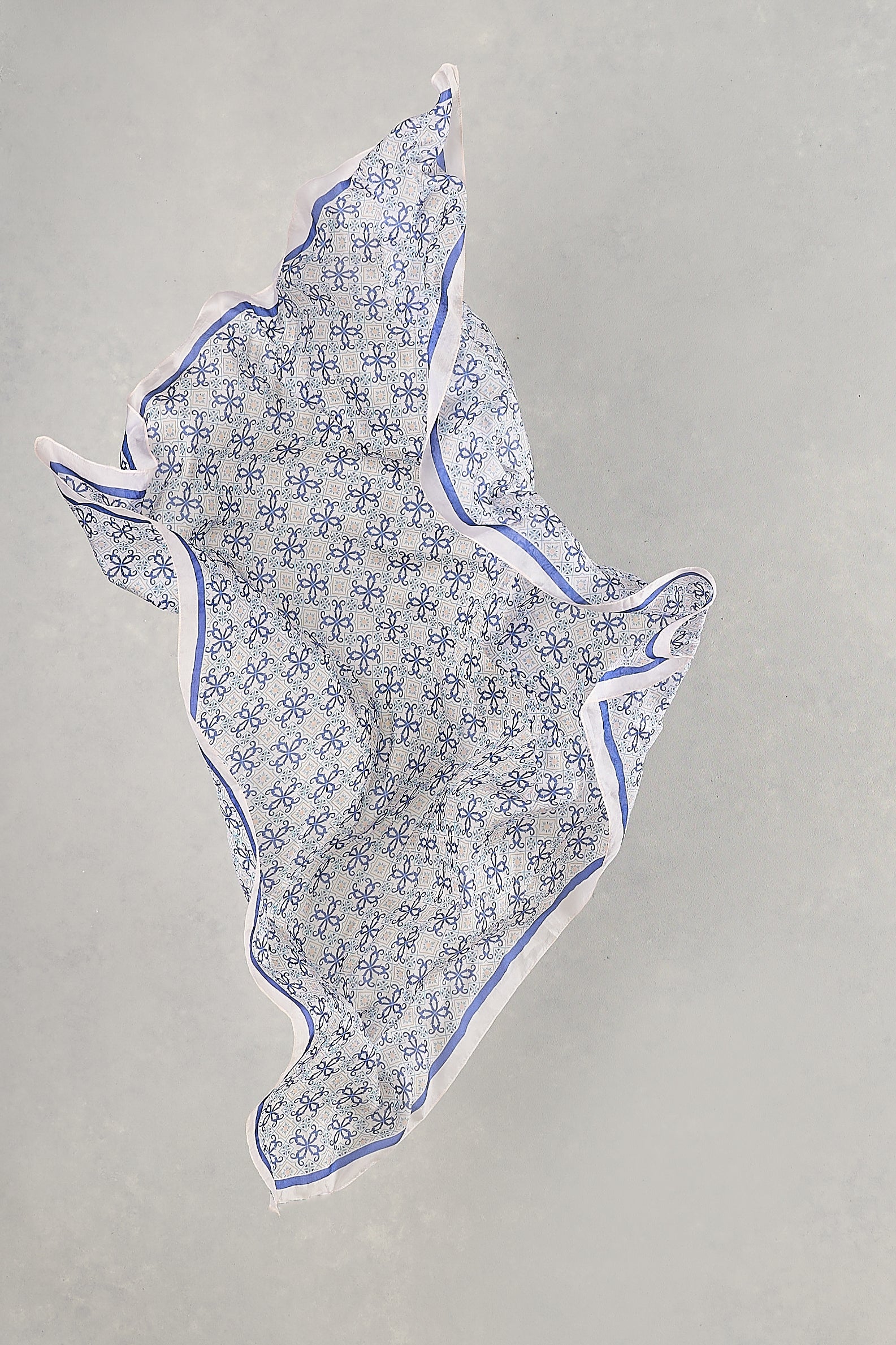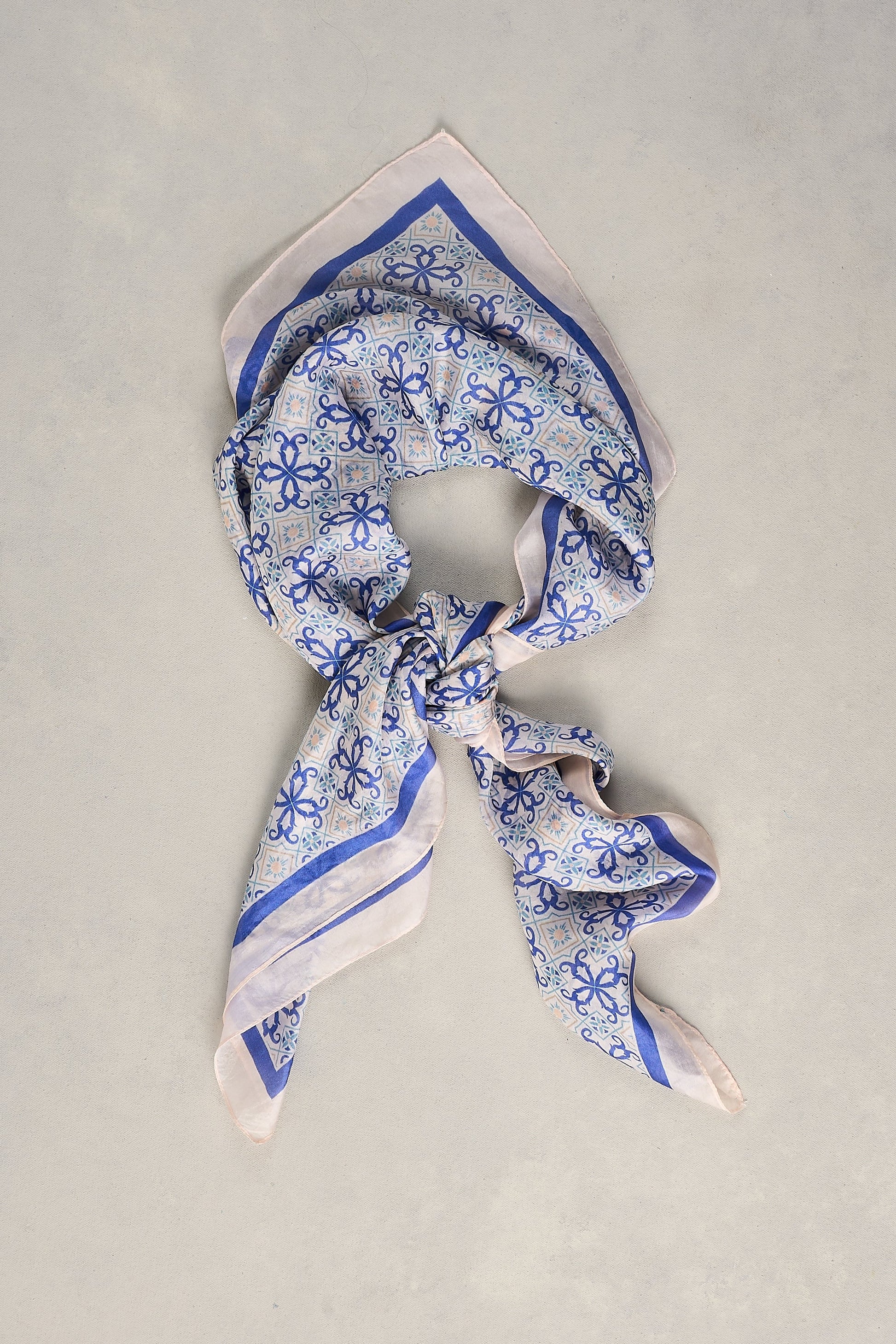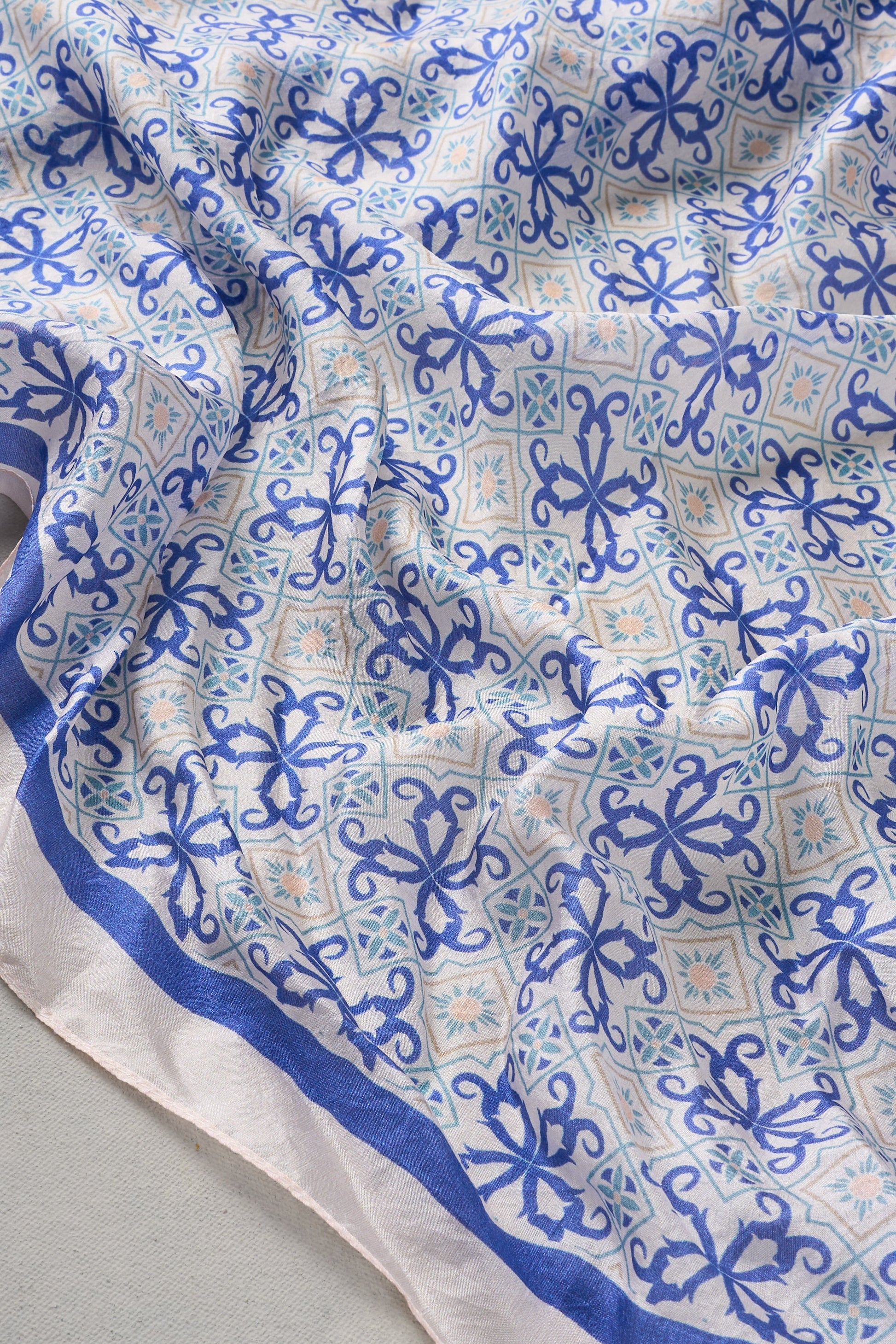 Inspired by traditional tilework, this square silk scarf is adorned with a striking blue and navy motif framed by a crisp white border. Elegant and sleek, it’s perfect tied at the neck, worn in the hair or knotted around your favourite tote.