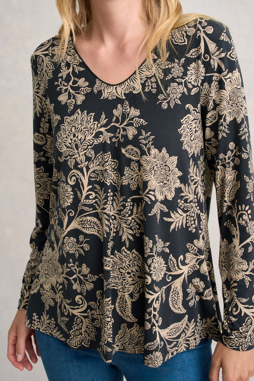 In our new Black and Stone Paisley print, this eye-catching long sleeve t-shirt is crafted from a lightweight LENZING™ ECOVERO™ viscose elastane jersey. With a lovely V-neck and relaxed fit, this is an essential layering piece.