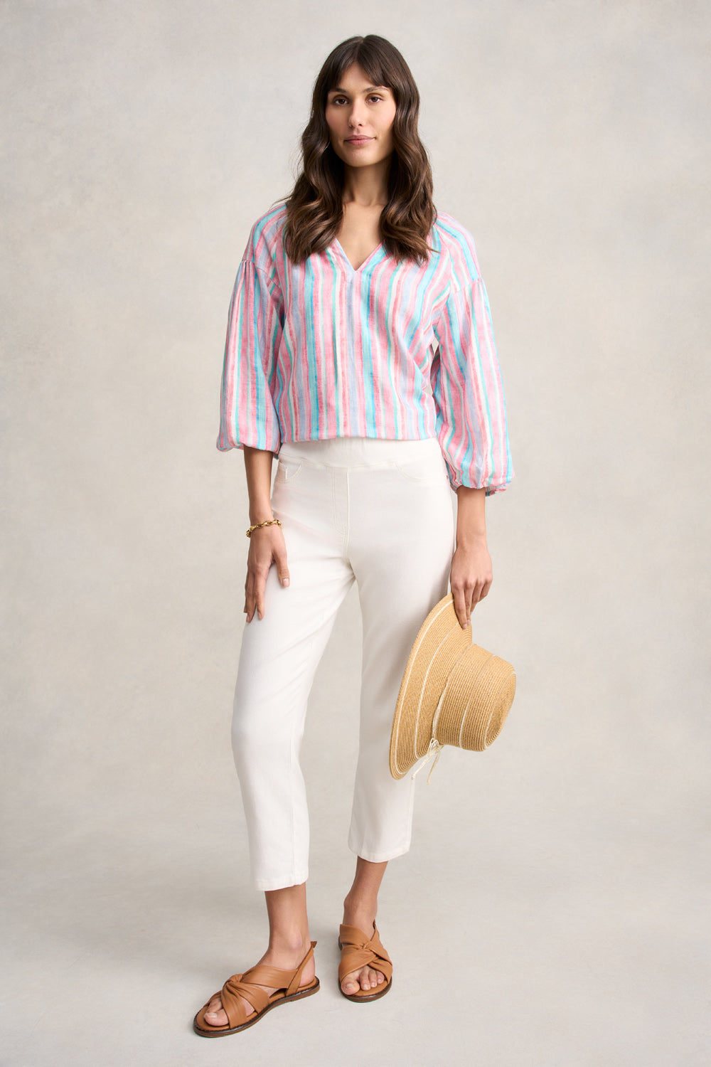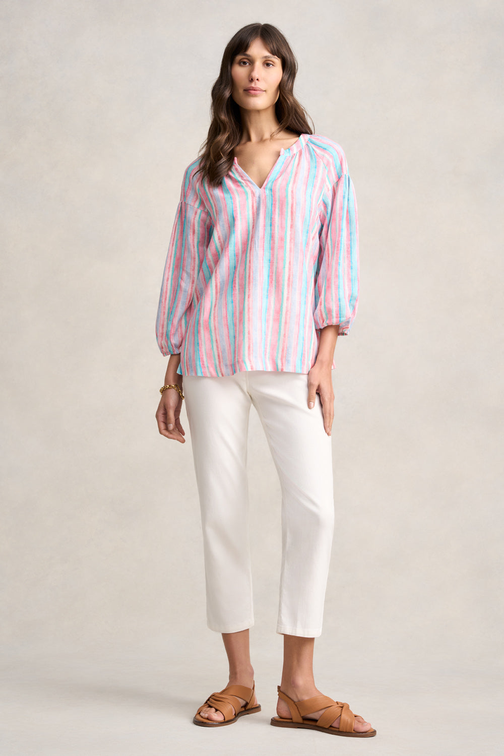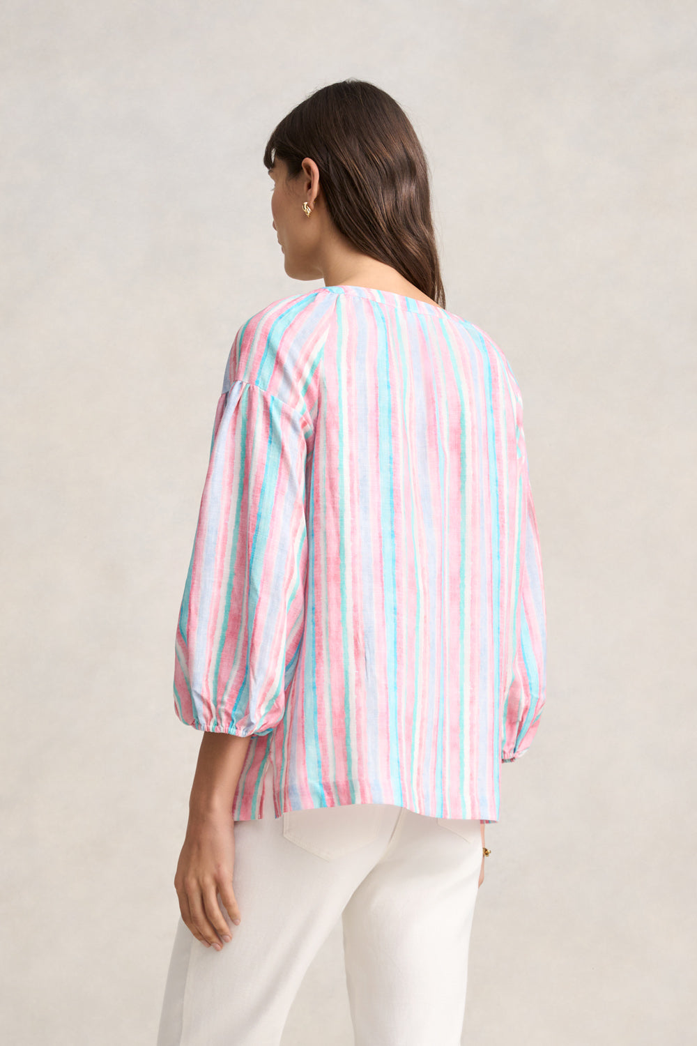 Crafted from tencel linen, our Puff Sleeve Linen Top will have you feeling vacation ready. Featuring our fun Summer Stripe, this top is a beautiful combination of colour and style. With long, statement puff sleeves with an elasticated cuff, this top will be a sweet addition to your holiday wardrobe. Wear it with our Linen Braid Detail Skirt or create a bold ensemble with the matching Stripe Resort Pant.