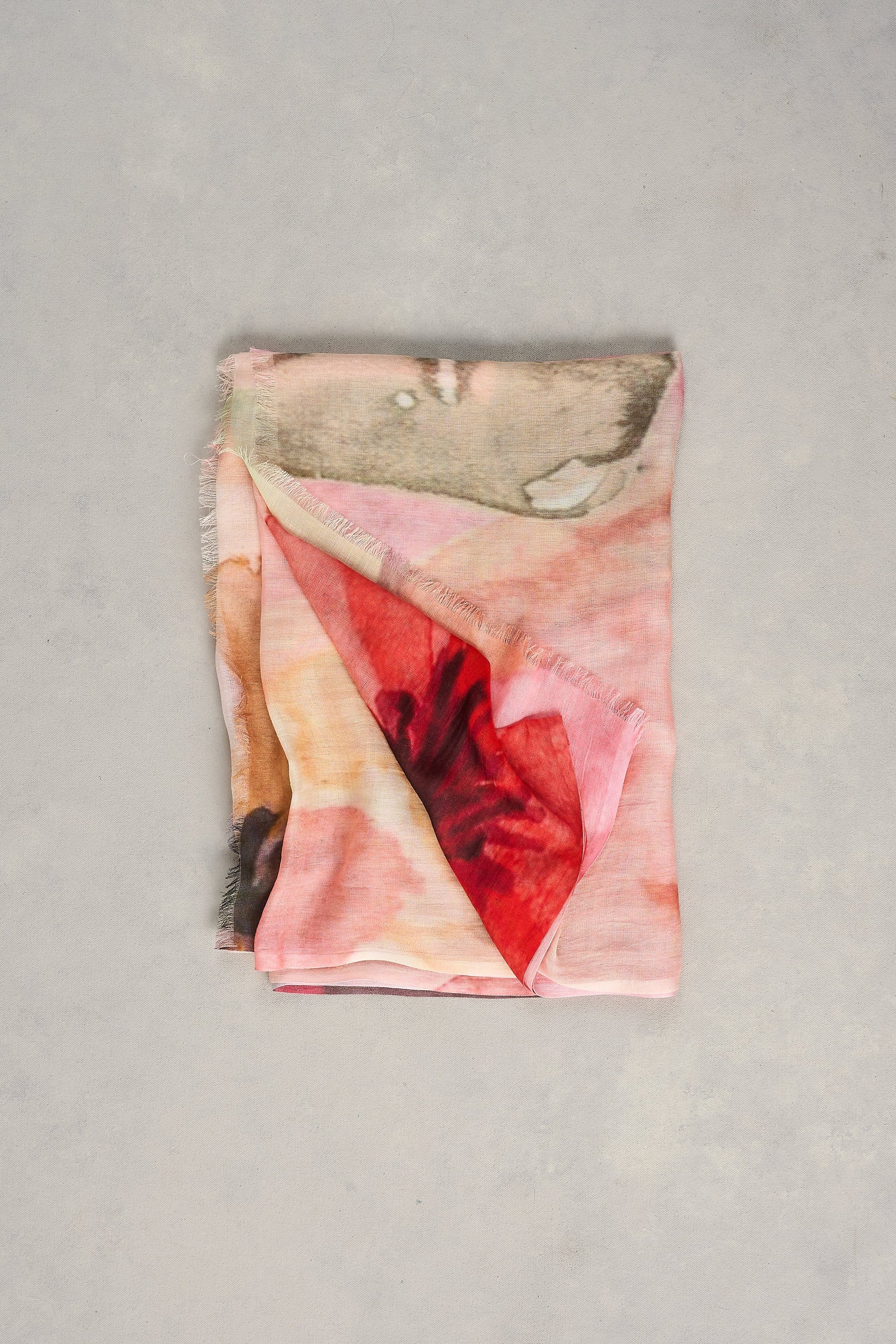 Soft and painterly, this modal scarf features a large-scale floral print in romantic washes of colour. Lightweight with gently frayed edges, it drapes with ease and elegance.