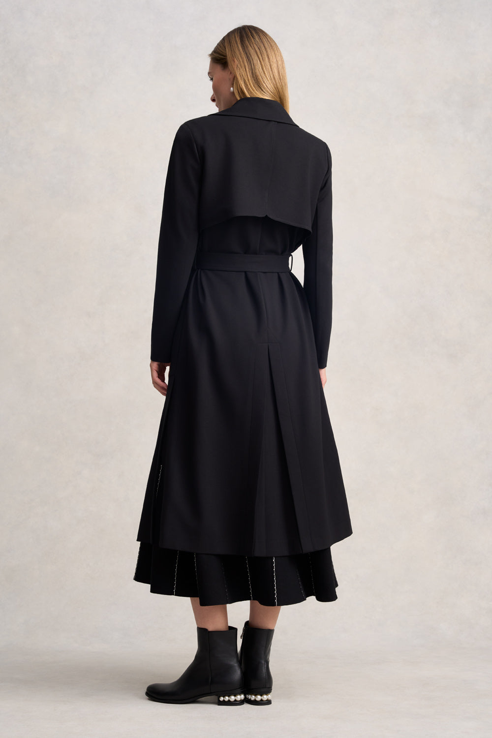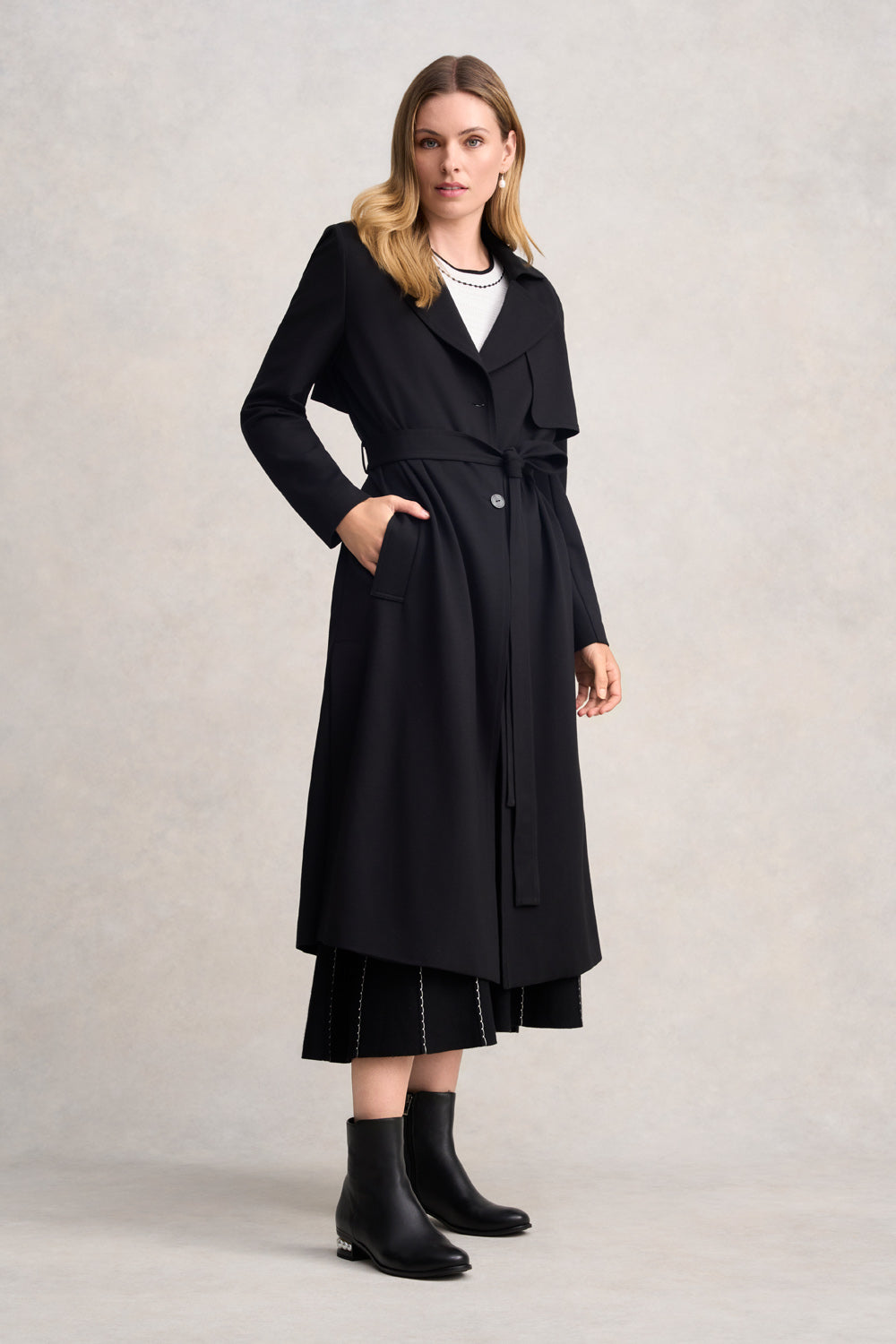 Crafted from ponte with superior stretch, comes this exceptionnel trench coat. Versatile in black, this coat also features a chic inner lining with the artful France Capital vintage print designed by Bianchini-Férier. With all the elements of a classic trench including side pockets and matching tie belt, layer this coat over our Pintuck Dress part of our Winter In Paris collection.