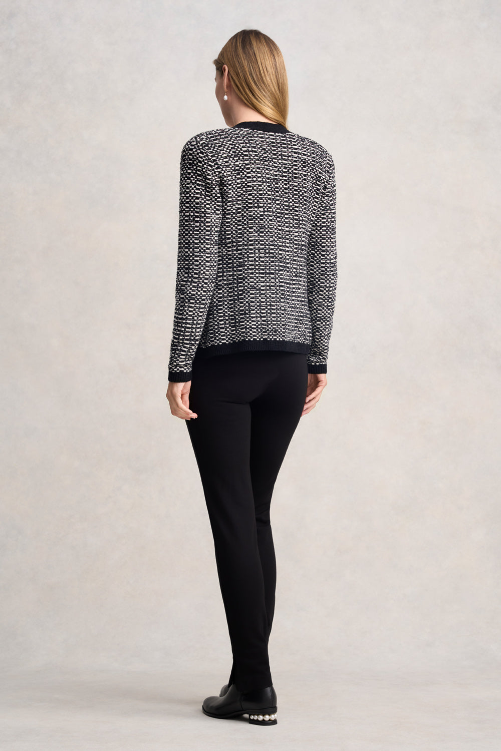 As autumn approaches, this textured cardigan is a perfect layering option. In a Black Multi stitch with a tweed look, this piece offers classic Parisian-inspired style but with the comfort of a knit. Featuring crested buttons and shoulder pads, elevate your wardrobe with this cardigan.