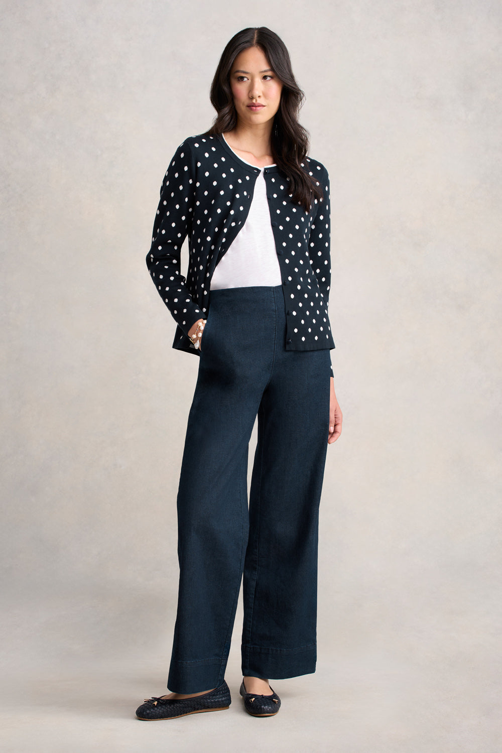 Your essential workwear cardigan is here! Whimsical and playful, this Deep Navy Spot cardigan features contrast edging along the neckline and self-fabricated buttons. A light layer option, pair it with your favourite summer t-shirt or our Sleeveless Cotton Knit.